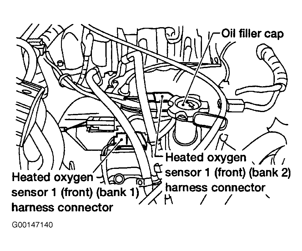 - Turn ignition off. Loosen and retighten engine ground bolts. See Figure . Disconnect appropriate HO2S1 harness connector. See Figure . Go to next step.