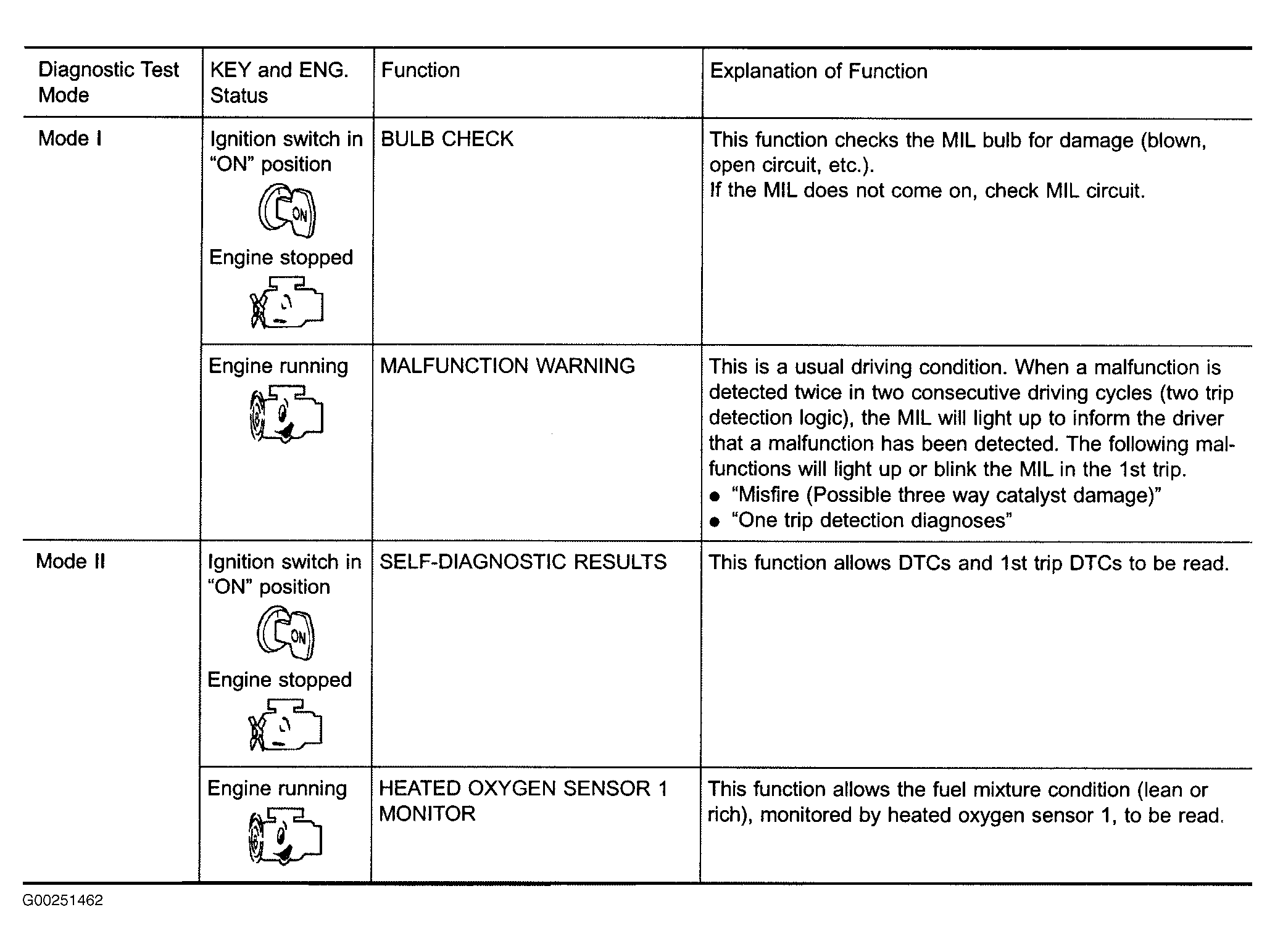 Malfunction Indicator Light (MIL) can be used for DTC retrieval and front Heated Oxygen Sensor (HO2S) monitoring. See Fig 1. When ignition is turned ON with engine OFF, MIL should illuminate. This is a bulb check. If MIL does not illuminate, repair MIL circuit. See appropriate INSTRUMENT PANELS article in ACCESSORIES & EQUIPMENT. Or, see DTC P0650: MIL CONTROL CIRCUIT under DIAGNOSTIC TESTS. When engine is started, MIL should go OFF. If MIL remains ON, ECM has detected a malfunction. If MIL is flashing when engine is running, ECM may be in diagnostic test mode II.
