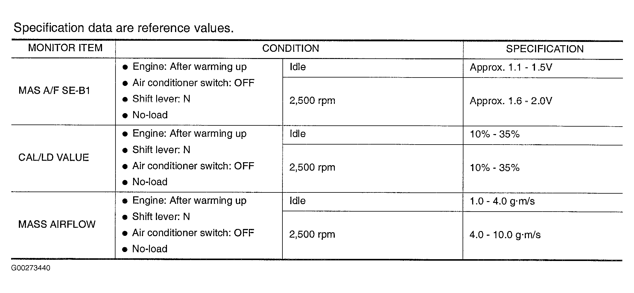 Fig 1: DTCs P0102 & P0103 CONSULT-II Reference Value In Data Monitor Mode