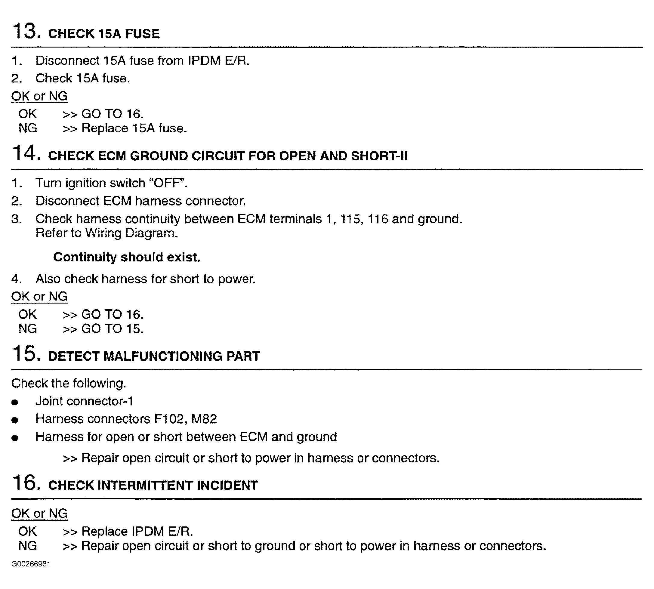 For ECM power and ground circuit wiring diagram and diagnostic procedure, see Fig 1-Fig 7 . If no problem is found, check ignition signal. See IGNITION SIGNAL CIRCUITS  under IGNITION SYSTEM. For intermittent diagnosis, see INTERMITTENTS in TROUBLE SHOOTING - NO CODES article.