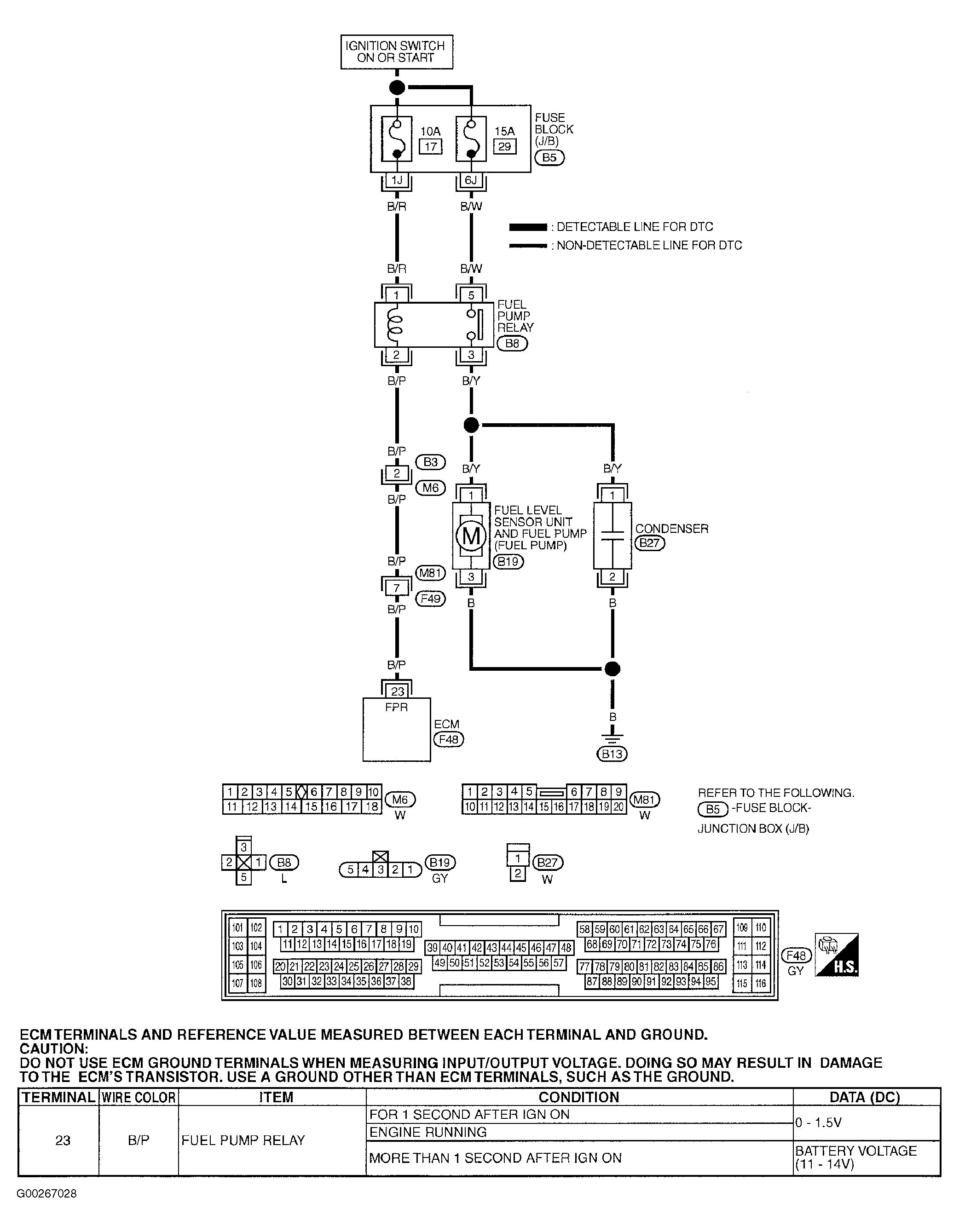 For fuel pump control system diagnosis and testing procedure, see Fig 2-Fig 5 . For fuel pump control circuit wiring diagram, see Fig 1. To check condenser, see FUEL SYSTEM CONDENSER . To check fuel pump, see FUEL PUMP . For relay location, see ECM & FUEL PUMP RELAY LOCATIONS  table. If no problem is indicated at this time, problem may be intermittent. See INTERMITTENTS in TROUBLE SHOOTING - NO CODES article. For component removal and installation procedures, see appropriate REMOVAL & INSTALLATION article.