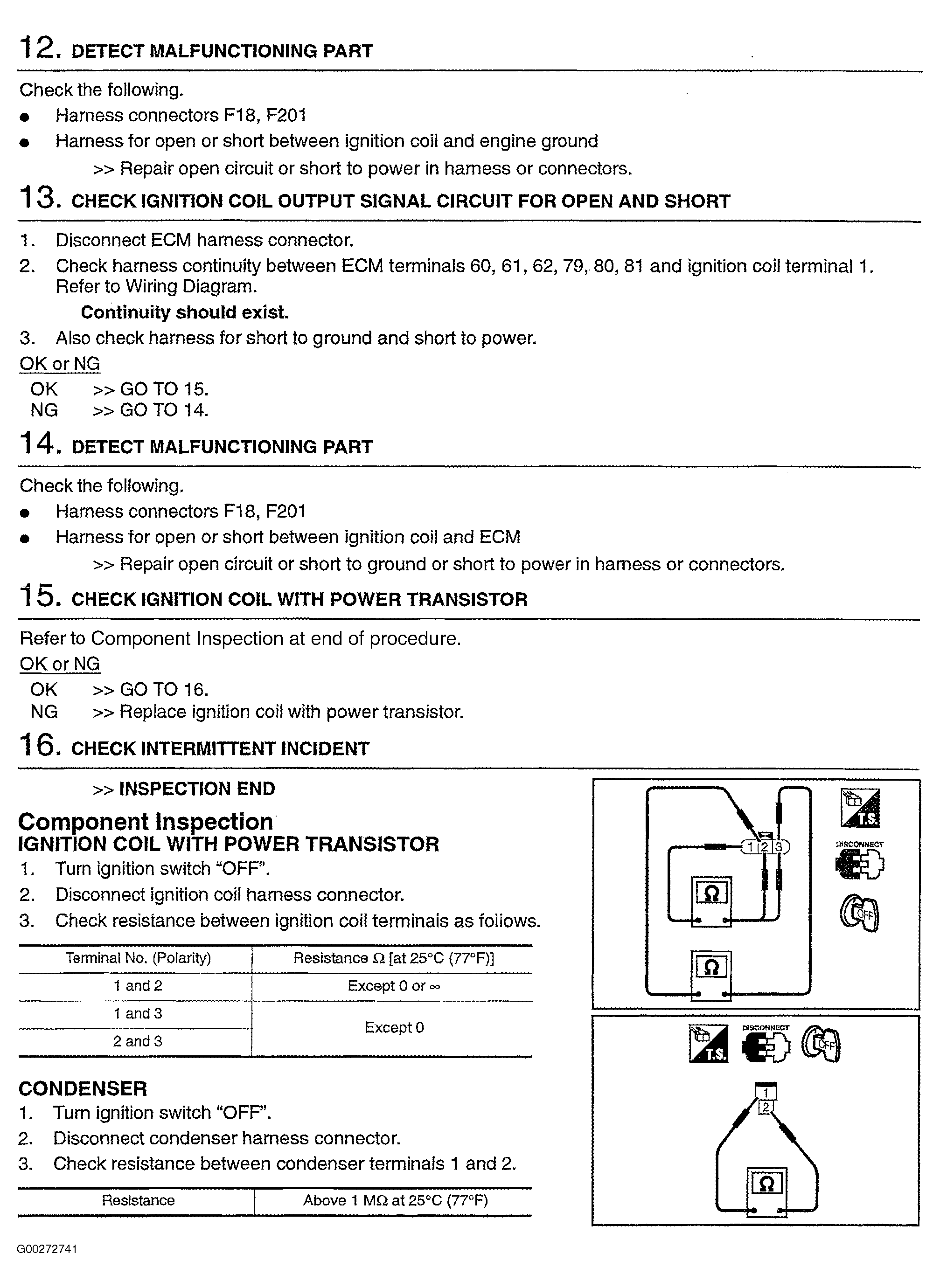 For ignition signal circuit system and component testing, see Fig 1-Fig 11 . For diagnosis of ECM power supply circuit, see POWER & GROUND CIRCUITS (350Z) . For intermittent problem, see INTERMITTENTS in TROUBLE SHOOTING - NO CODES article.