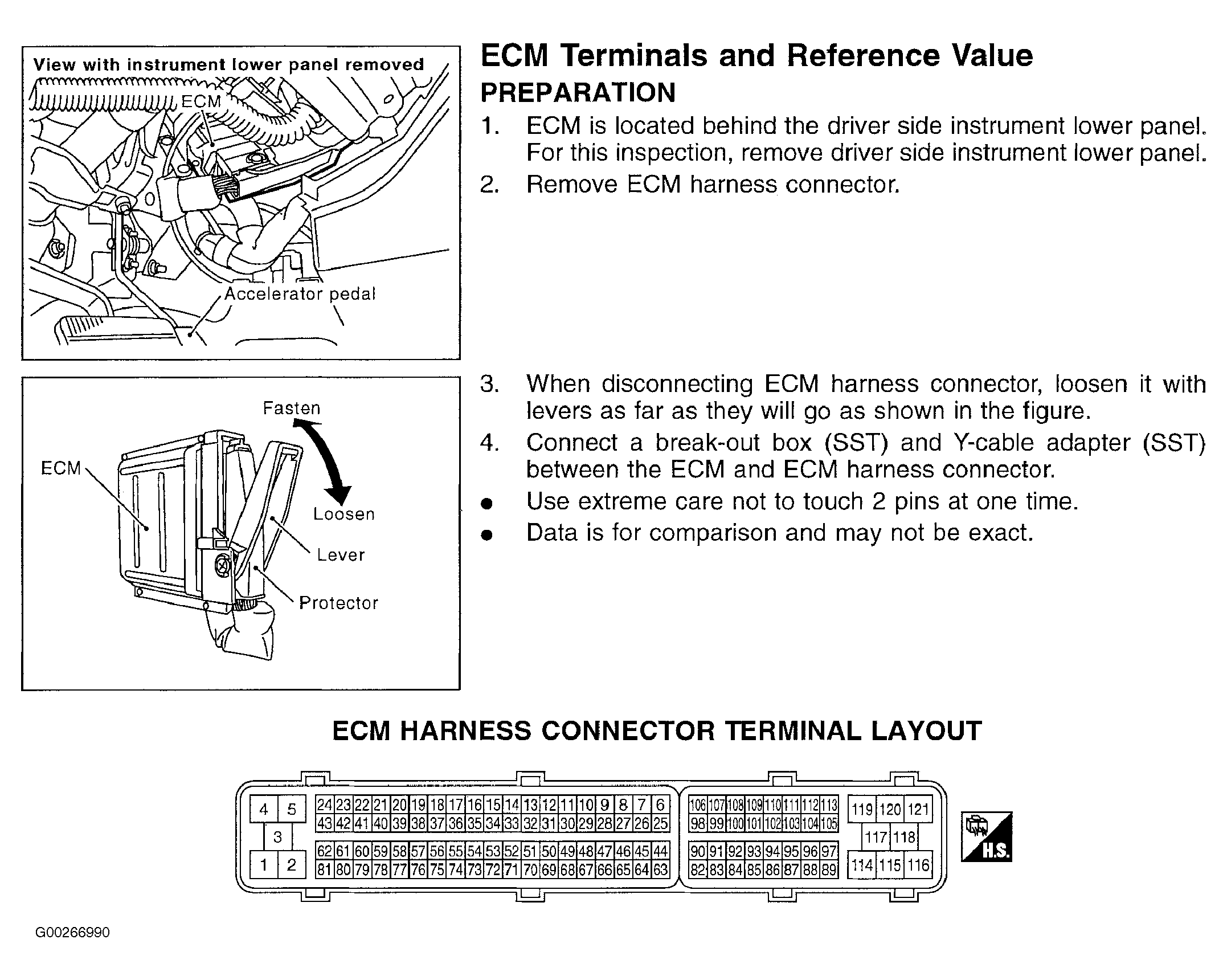 For engine control system component locations, see Figure-Figure . For ECM location, connector and terminal view, see Figure. For removal and installation of components, see appropriate REMOVAL & INSTALLATION article.