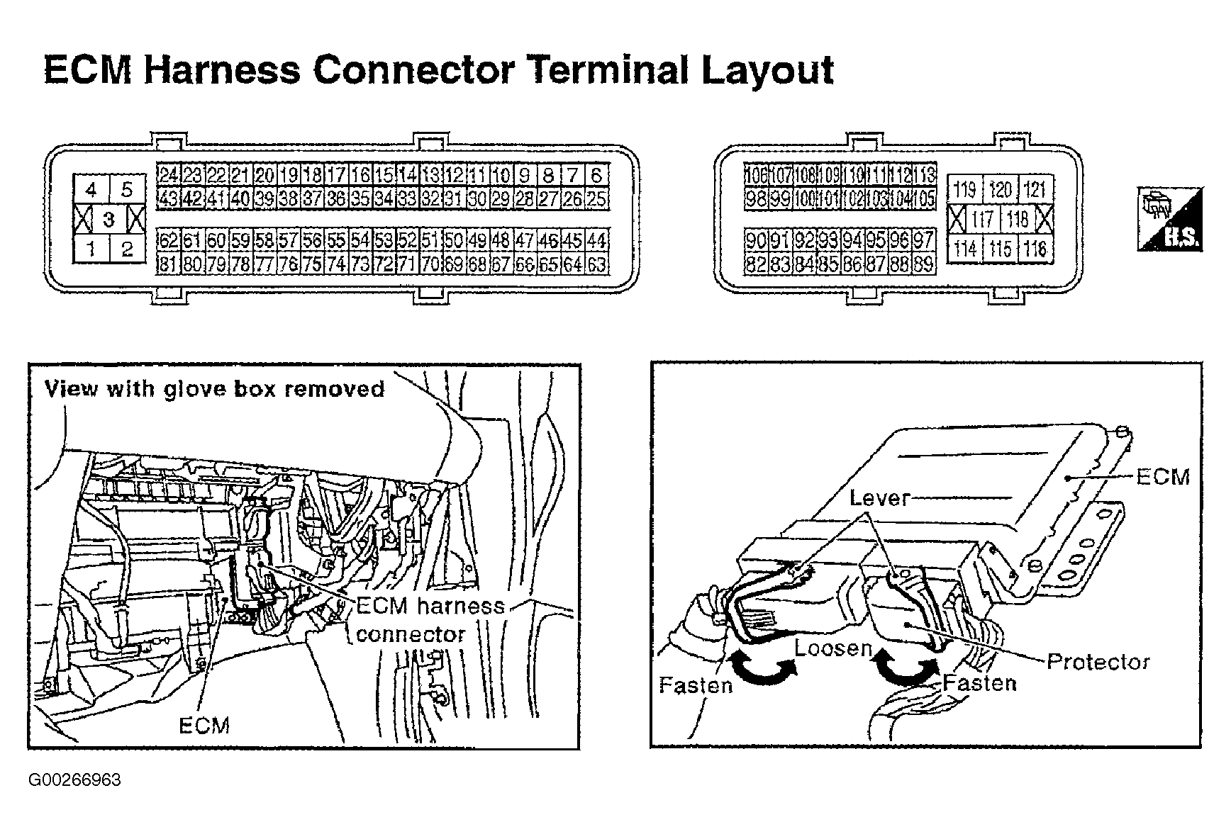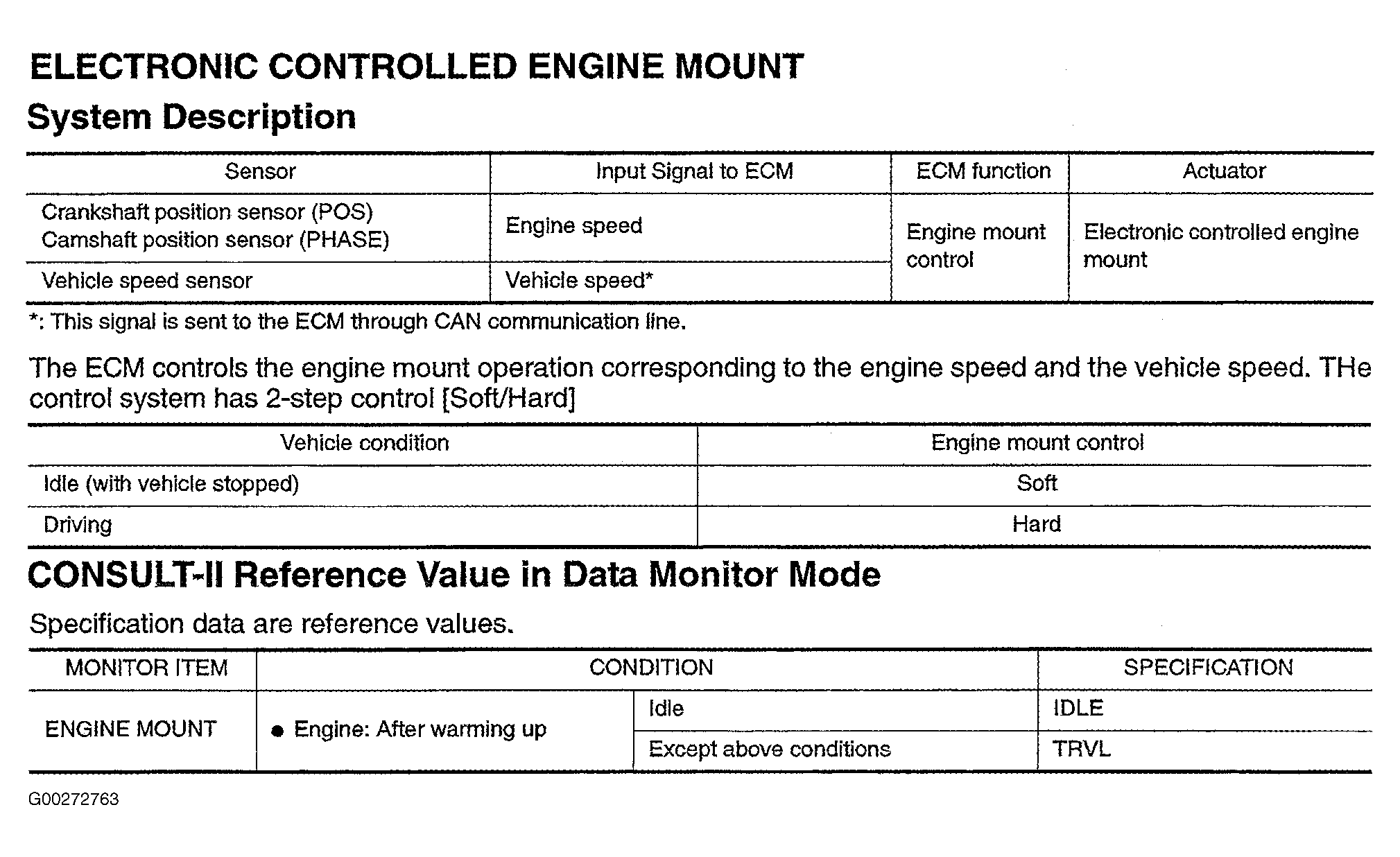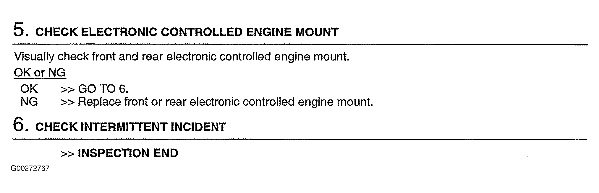 For electronic controlled engine mount system and component testing, see Fig 1-Fig 5 . For ECM location, connector and terminal view, see Figure. If problem is intermittent, see INTERMITTENTS in TROUBLE SHOOTING - NO CODES article.