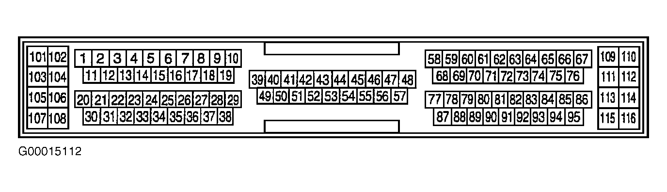 14. Turn ignition off. Disconnect ECM 116-pin harness connector. ECM is located under instrument panel. See Figure. Check continuity between ground and ECM harness connector terminal No. 59 (Black/Red wire). Check continuity between ground and ECM harness connector terminals No. 60, 106 and 108 (Black wires). See Figure. Continuity should exist at each measurement. Also, check circuits for short to voltage. If problem is found, go to next step. If no problem is found, go to step  16.