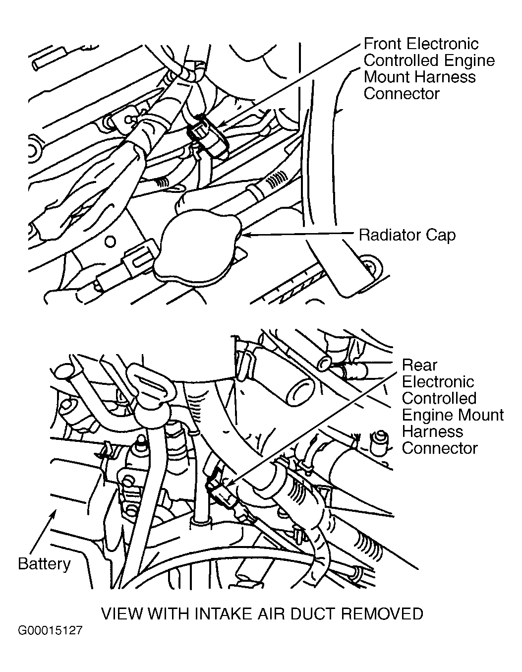 - If CONSULT-II is not available, start engine and warm to normal operating temperature. Set parking brake and let engine idle. While depressing brake pedal, shift transmission into Drive. Observe body vibration while increasing engine speed to 1000 RPM or more. Turn ignition off. Disconnect front or rear engine mount harness connectors. See Fig 1. Start engine and allow to idle. Observe body vibration. If body vibration is not more noticeable than vibration observed with engine running at 1000 RPM or more, go to next step. If body vibration is more noticeable than vibration than observed with engine running at 1000 RPM or more, go to step 6.