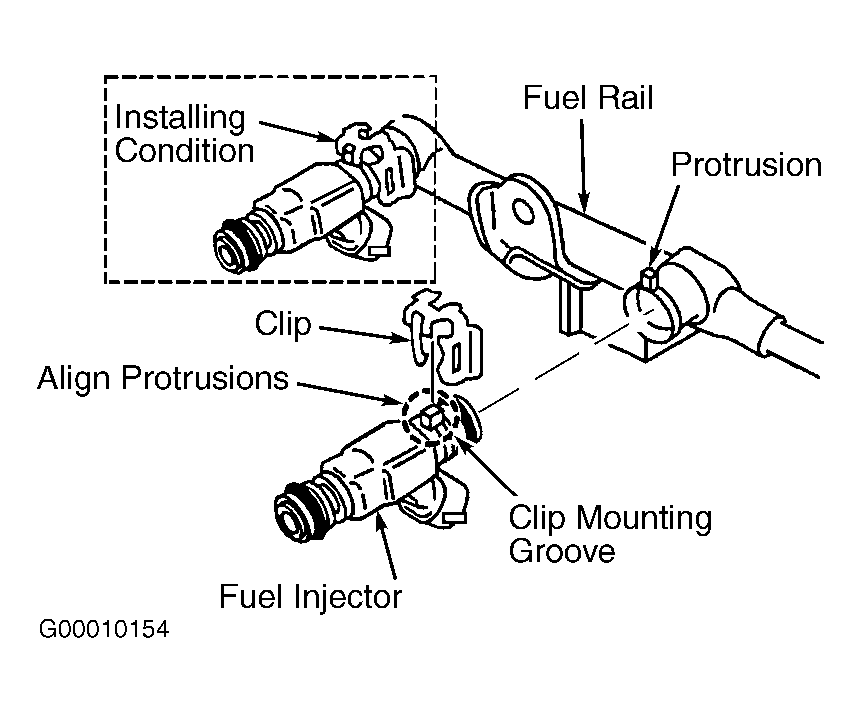 Install NEW "O" rings on injectors and lubricate with clean engine oil. Install injectors to fuel rail. Align protrusion on fuel injector with protrusion on fuel rail. See Fig 1. Install NEW injector retaining clip. Install fuel rail. Tighten fuel rail bolts (in 2 steps) to specification. See TORQUE SPECIFICATIONS . To complete installation, reverse removal procedure.