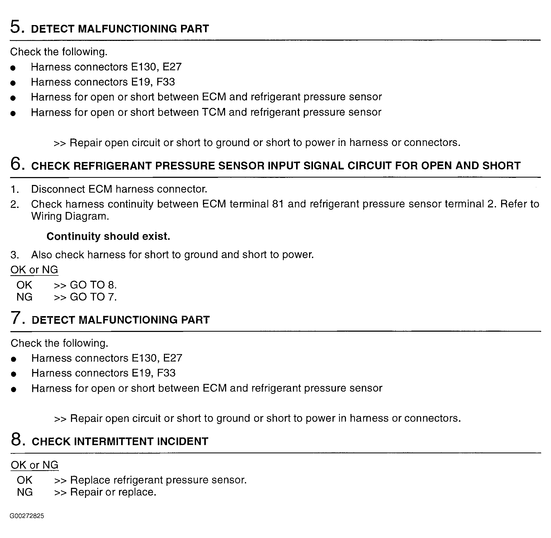 For refrigerant pressure sensor system and component testing, see Fig 1-Fig 5 . For engine control system component locations, see Figure-Figure . For ECM location, connector and terminal view, see Figure. If problem is intermittent, see INTERMITTENTS in TROUBLE SHOOTING - NO CODES article. For removal and installation of components, see appropriate REMOVAL & INSTALLATION article.