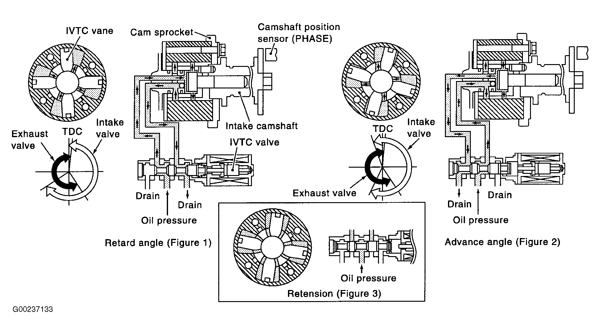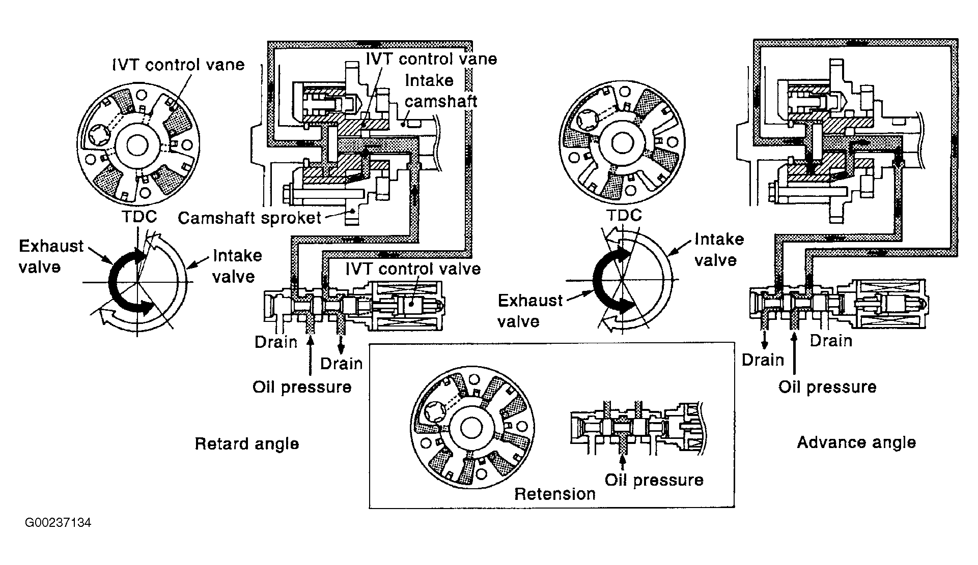 The intake valve timing control solenoid valve changes the oil amount and direction of flow through intake valve timing control unit or stops oil flow. See Fig 1 and Fig 2 .