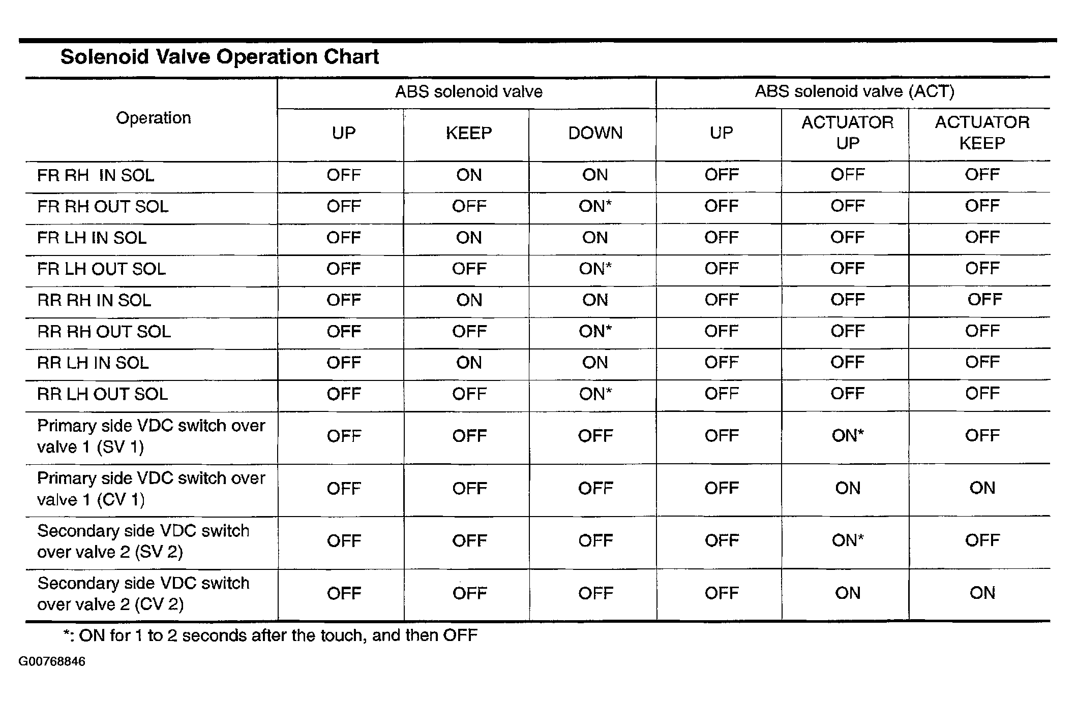 1. For ABS solenoid valve, touch "UP", "KEEP", and "DOWN". Then use screen monitor to check that solenoid valve operates as shown in Solenoid Valve Operation Chart. Refer to Fig 2 .