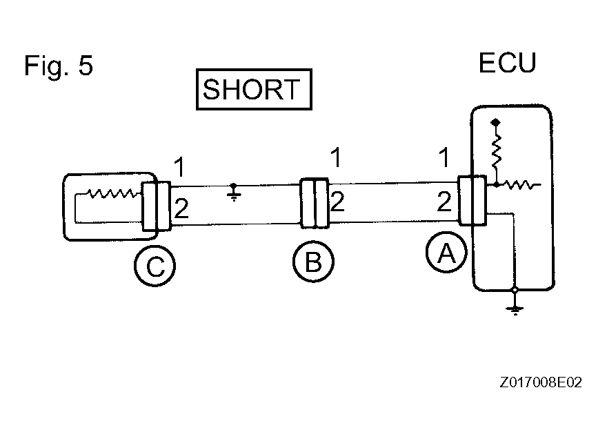 Tester Connection Specified Condition Connector A terminal 1 - Body ground 5 V Connector B terminal 1 - Body ground 5 V Connector C terminal 1 - Body ground Below 1 V If the results match the examples above, an open circuit exists in the wire harness between terminal 1 of connector B and terminal 1 of connector C.