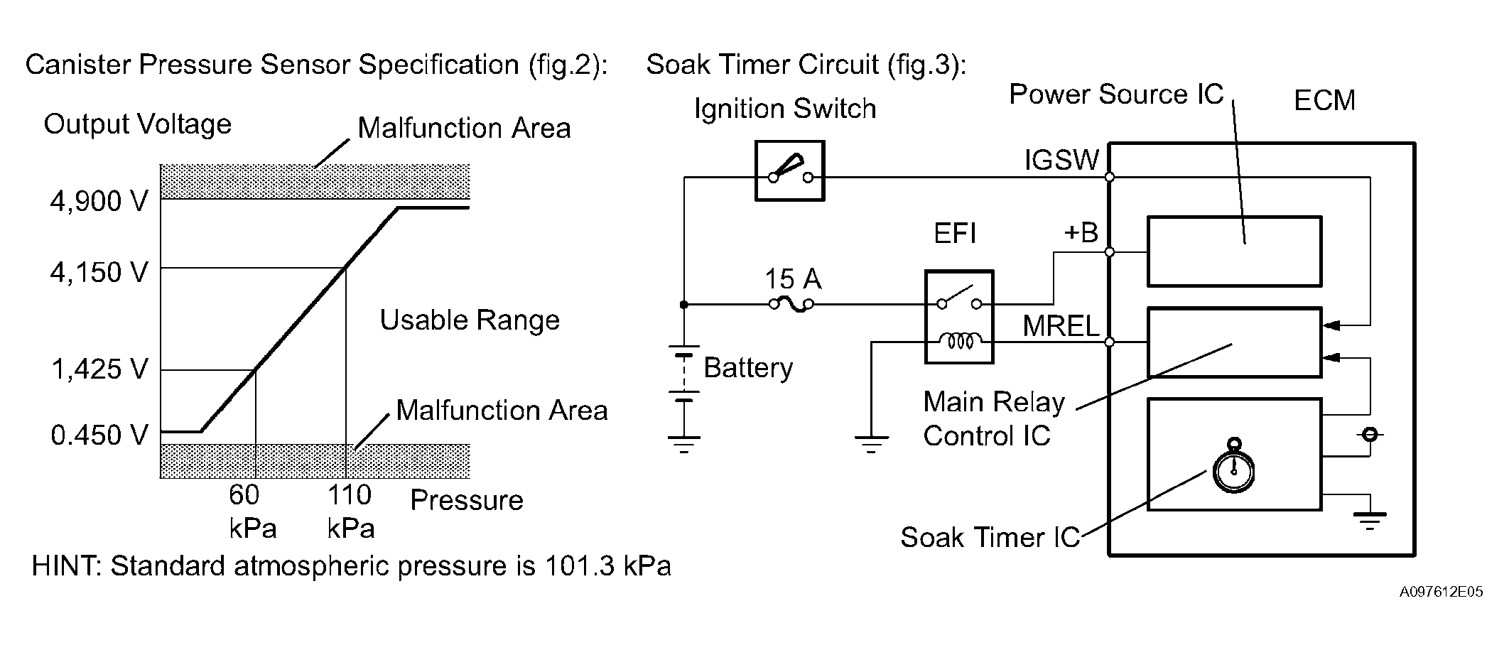 | Soak timer | Built into ECM. To ensure accurate EVAP monitor, measures 5 hours (+-15 minutes) after ignition switch OFF. This allows fuel to cool down, stabilizing Fuel Tank Pressure (FTP). When approximately 5 hours elapsed, ECM activates. |