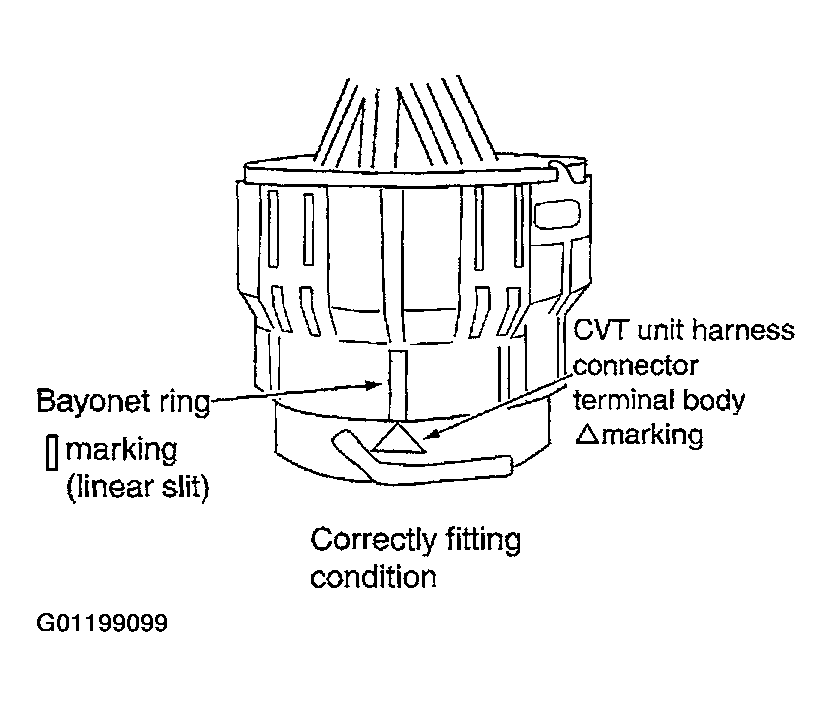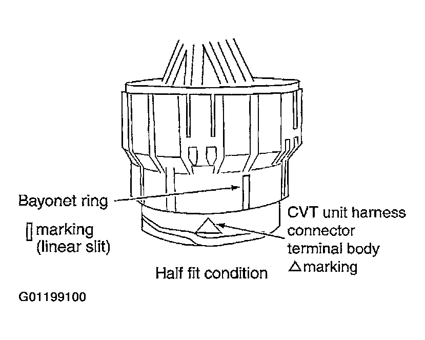 - Securely align delta marking on CVT unit harness connector terminal body with bayonet ring slit. Then, be careful not to make a half fit condition as shown in Fig 3.