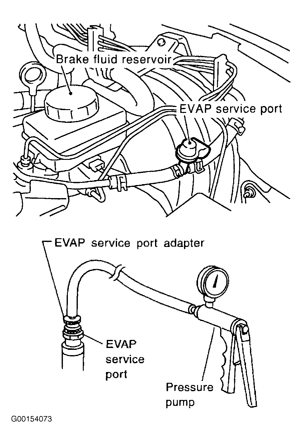 - Connect EVAP Service Port Adapter (J41413-OBD) to EVAP service port. See Figure. Connect a suitable pressure pump with hose and gauge to adapter.