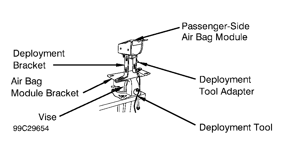 - Firmly secure Air Bag Module Bracket (J41246) in a vise. Install two Deployment Brackets (J39401-100) to air bag module bracket. Attach passenger-side air bag module to deployment brackets. See Fig 1 .