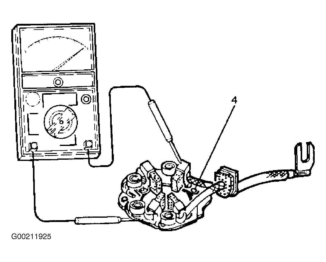 Check for continuity between brush holder (+) (4) and base (-). Replace, if there is continuity. See Fig 1 .