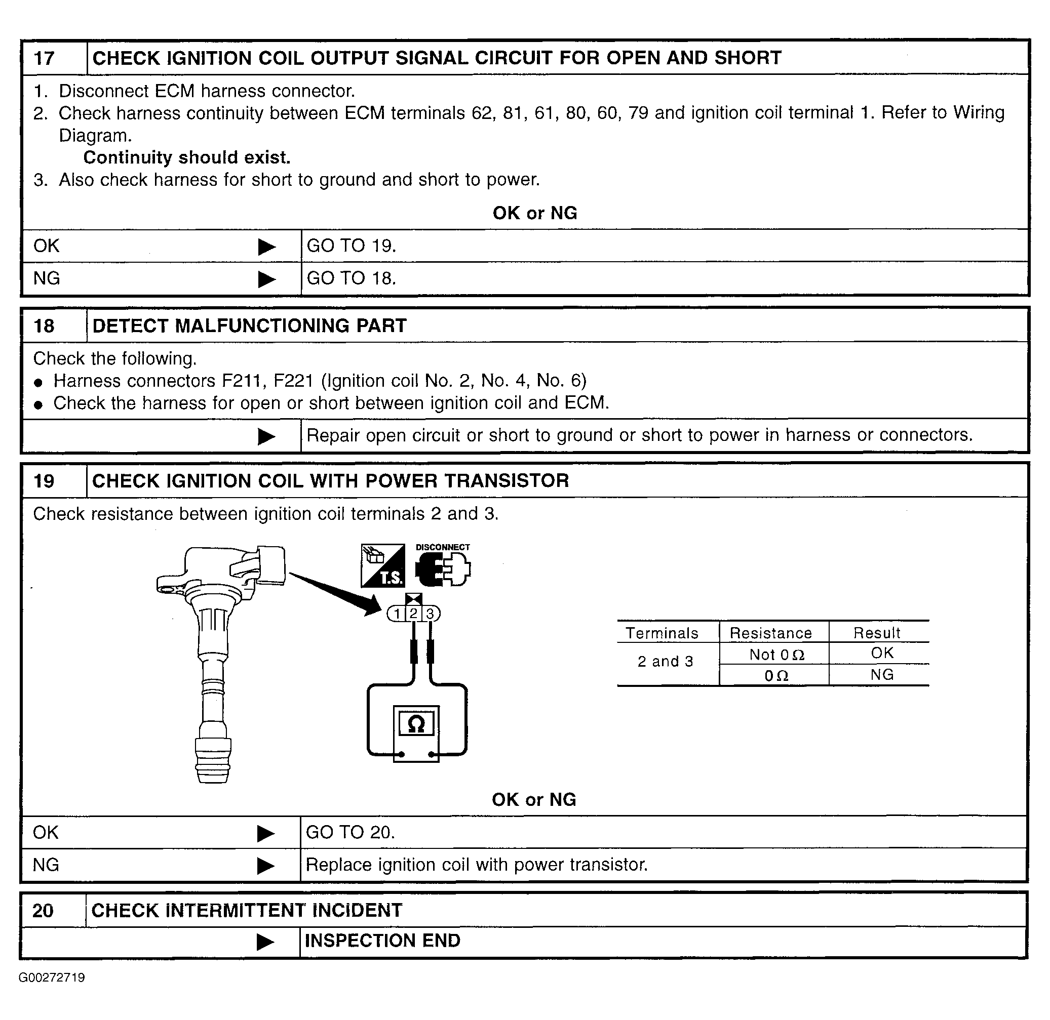 For ignition signal circuit system and component testing, see Fig 1-Fig 10 . For diagnosis of ECM power supply circuit, see POWER & GROUND CIRCUITS (PATHFINDER) . For intermittent problem, see INTERMITTENTS in TROUBLE SHOOTING - NO CODES article.