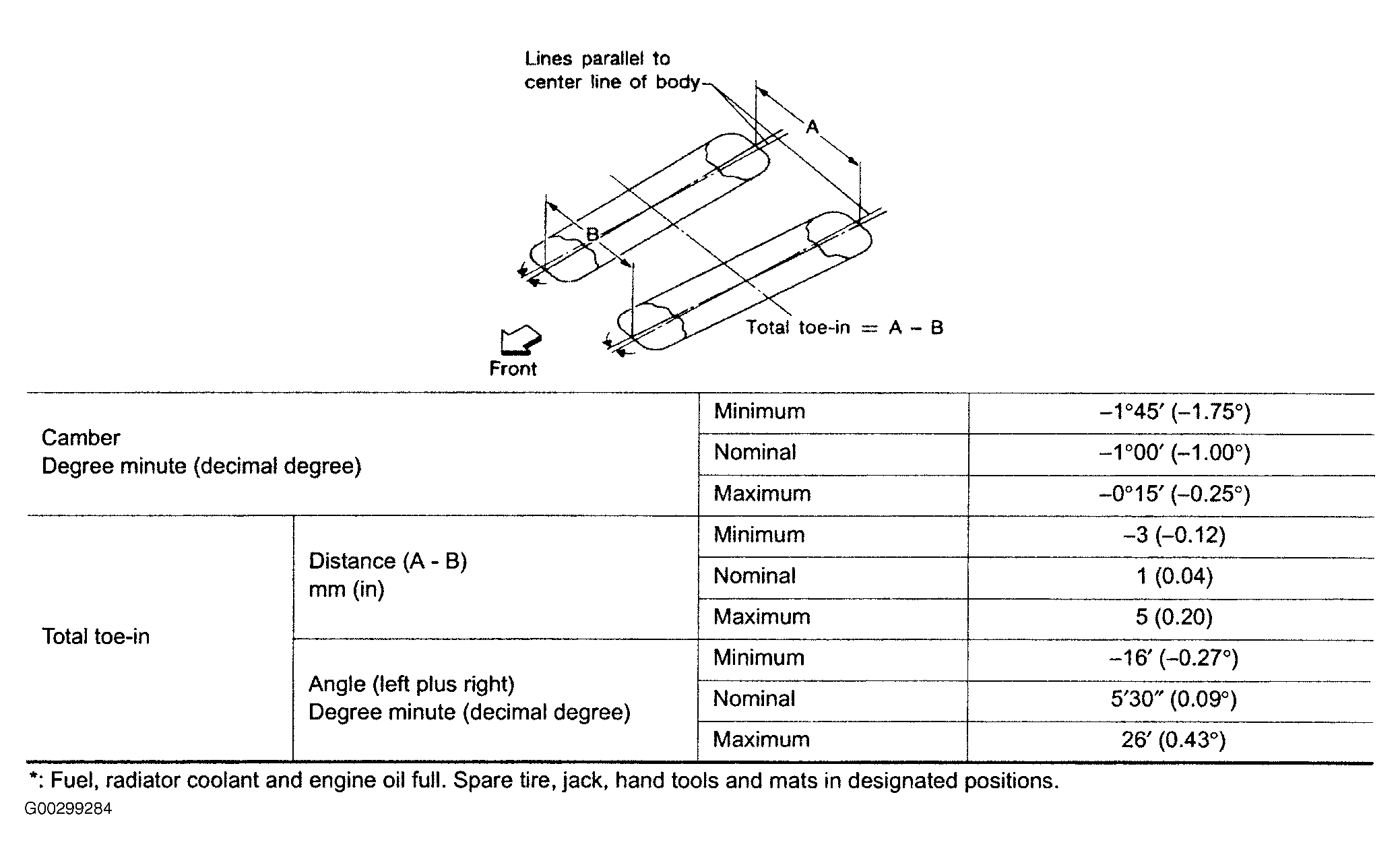 Use illustrations for front and rear wheel alignment specifications. See