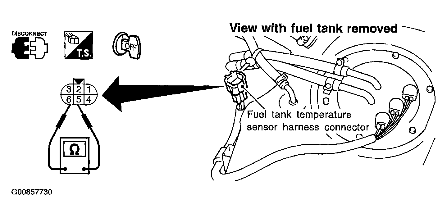 NOTE: For fuel pump harness connector terminal identification, refer to Fig 8 - Check harness continuity between fuel pump terminal 6 and body ground, fuel pump terminal 5 and fuel pump relay terminal 3.