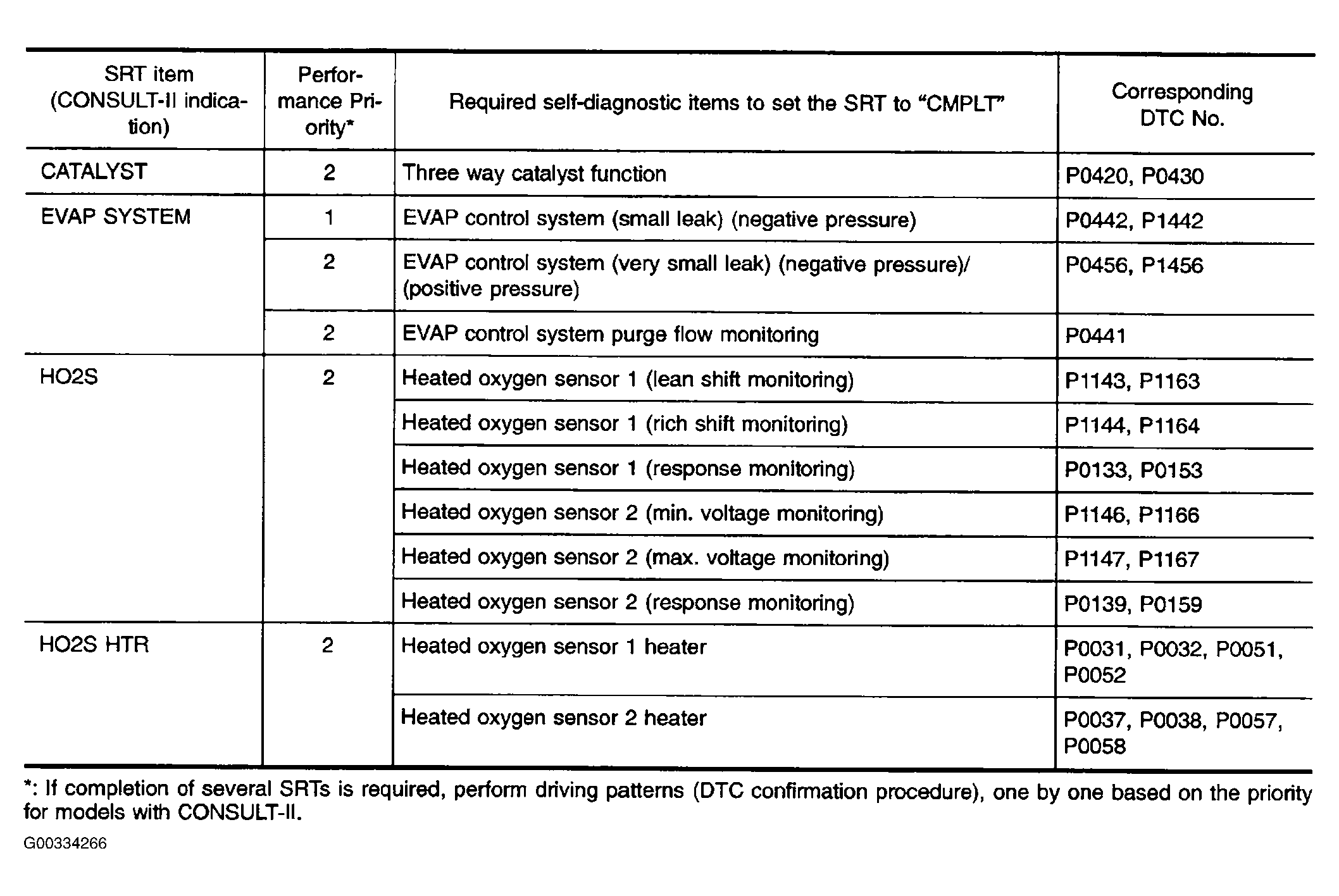To set all SRT codes, self-diagnosis for the items indicated above must be performed one or more times. Each diagnosis may require a long period of actual driving under various conditions.