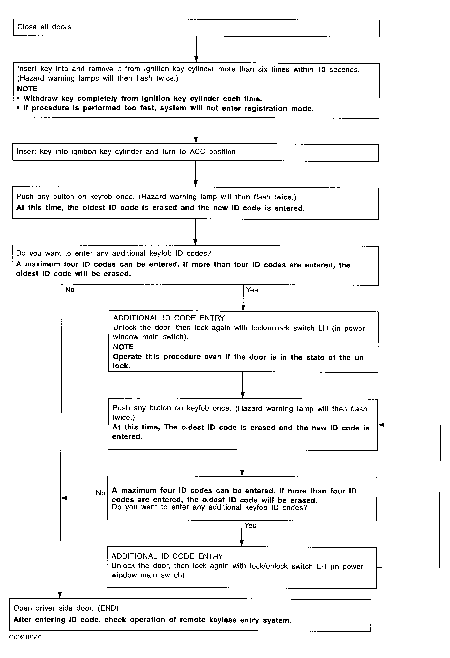 If a keyfob is lost, the ID code of the lost keyfob must be erased to prevent unauthorized use. A specific ID code can be erased with CONSULT-II. However, when the ID code of a lost keyfob is not known, all keyfob ID codes should be erased. After all ID codes are erased, the ID codes of all remaining and/or new keyfob must be re-registered. To erase all ID codes in memory, register one ID code (keyfob) 4 times. After all ID codes are erased, the ID codes of all remaining and/or new keyfob must be re-registered. When registering an additional keyfob, the existing ID codes in memory may or may not be erased. If 4 ID codes are stored in memory, when an additional code is registered, only the oldest code is erased. If less than 4 ID codes are stored in memory, when an additional ID code is registered, the new ID code is added and no ID codes are erased. If you need to activate more than 2 additional new keyfobs, repeat the procedure for each new keyfob.