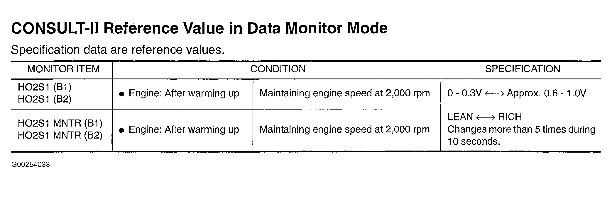 Home >> Nissan-Datsun >> 2004 >> Sentra SE-R Spec V >> Repair and Diagnosis >> External Pages >> Different car >> Section 213 (Engine Controls - Self-Diagnostics) >> Diagnostic Tests >> DTC P0133 & DTC P0153: Heated Oxygen Sensor 1 >> CONSULT-II Reference Value In Data Monitor Mode