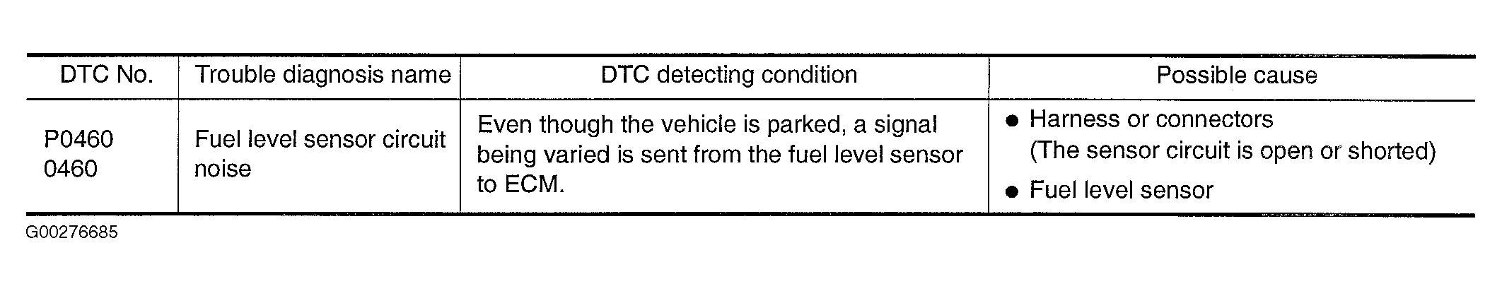 When the vehicle is parked, naturally the fuel level in the fuel tank is stable. It means that output signal of the fuel level sensor does not change. If ECM senses sloshing signal from the sensor, fuel level sensor malfunction is detected. For on board diagnosis logic, see Fig 1 .