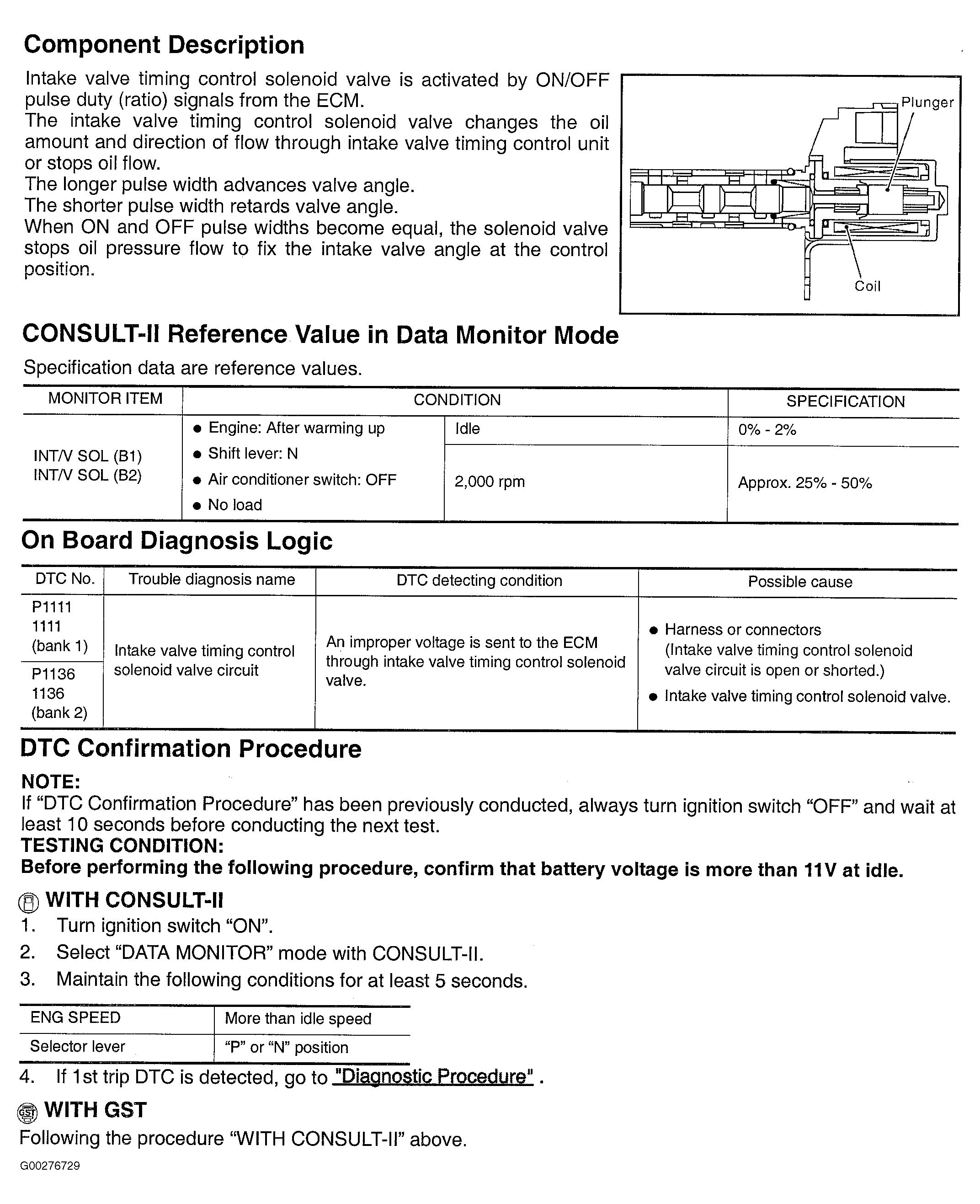 Home >> Nissan-Datsun >> 2004 >> Sentra SE-R Spec V >> Repair and Diagnosis >> External Pages >> Different car >> Section 213 (Engine Controls - Self-Diagnostics) >> Diagnostic Tests >> DTC P1111 & DTC P1136: Intake Valve Timing Control Solenoid Valve >> Component Description, CONSULT-II Reference Value In Data Monitor Mode, On Board Diagnosis Logic & DTC Confirmation Procedure
