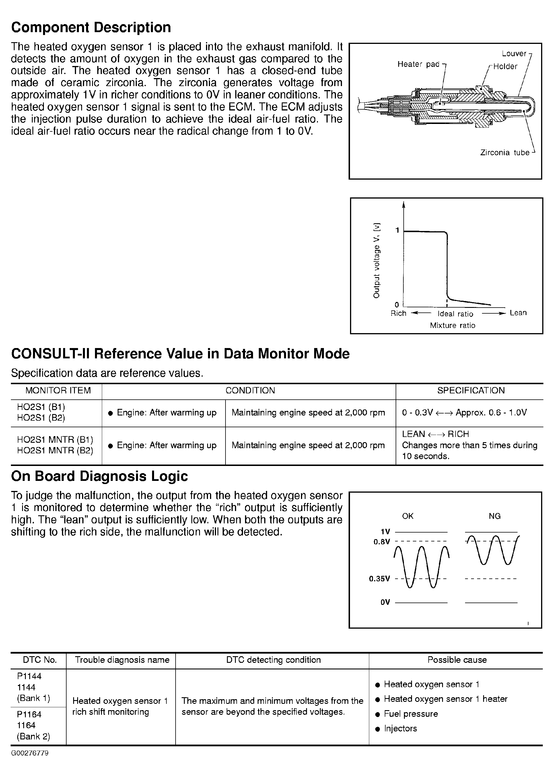 Home >> Nissan-Datsun >> 2004 >> Sentra SE-R Spec V >> Repair and Diagnosis >> External Pages >> Different car >> Section 213 (Engine Controls - Self-Diagnostics) >> Diagnostic Tests >> DTC P1144 & DTC P1164: Heated Oxygen Sensor 1 >> Component Description, CONSULT-II Reference Value In Data Monitor Mode & On Board Diagnosis Logic