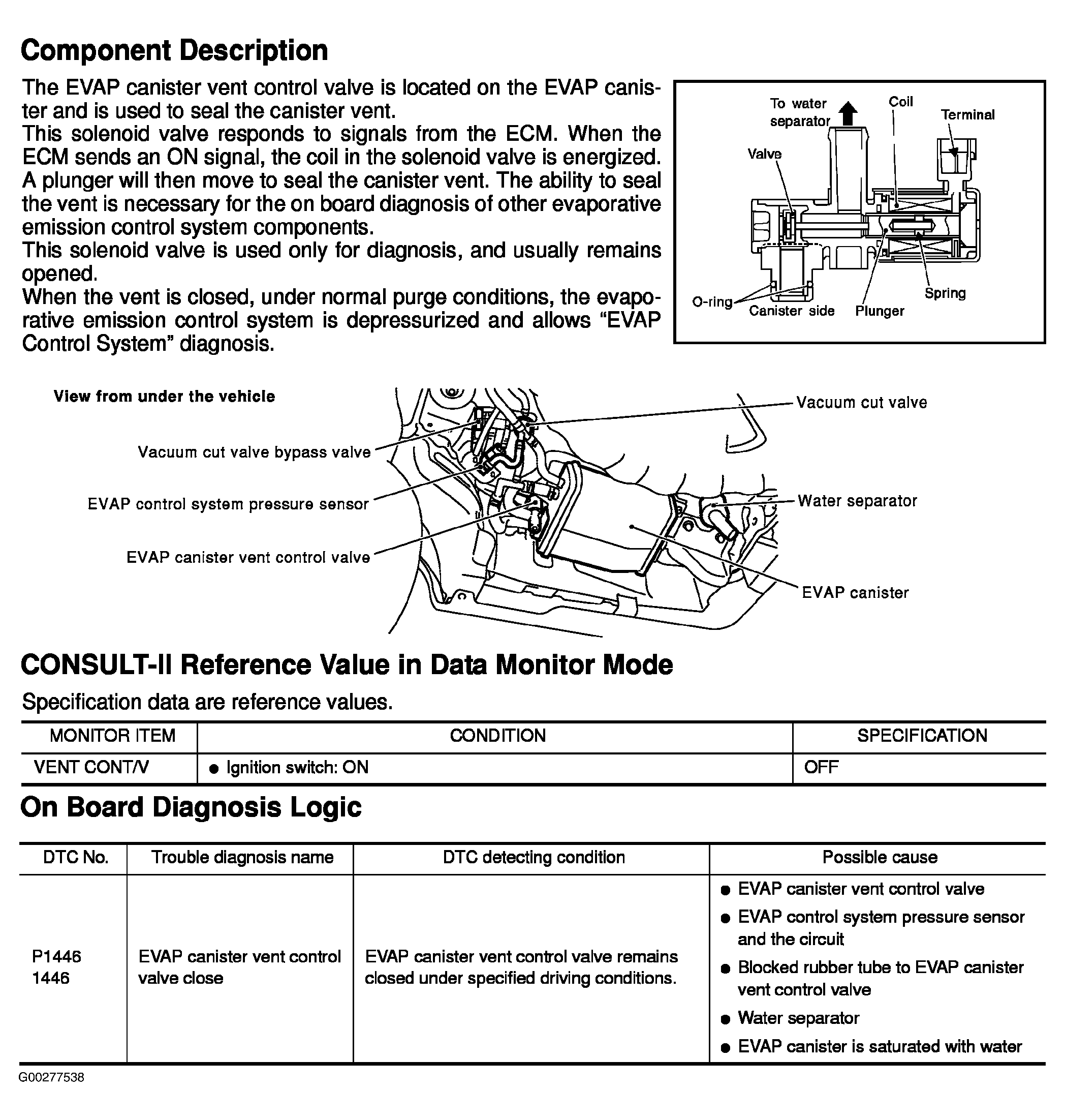 Home >> Nissan-Datsun >> 2004 >> Sentra SE-R Spec V >> Repair and Diagnosis >> External Pages >> Different car >> Section 213 (Engine Controls - Self-Diagnostics) >> Diagnostic Tests >> DTC P1446: EVAP Canister Vent Control Valve (Closed) >> Component Description, CONSULT-II Reference Value In Data Monitor Mode & On Board Diagnosis Logic