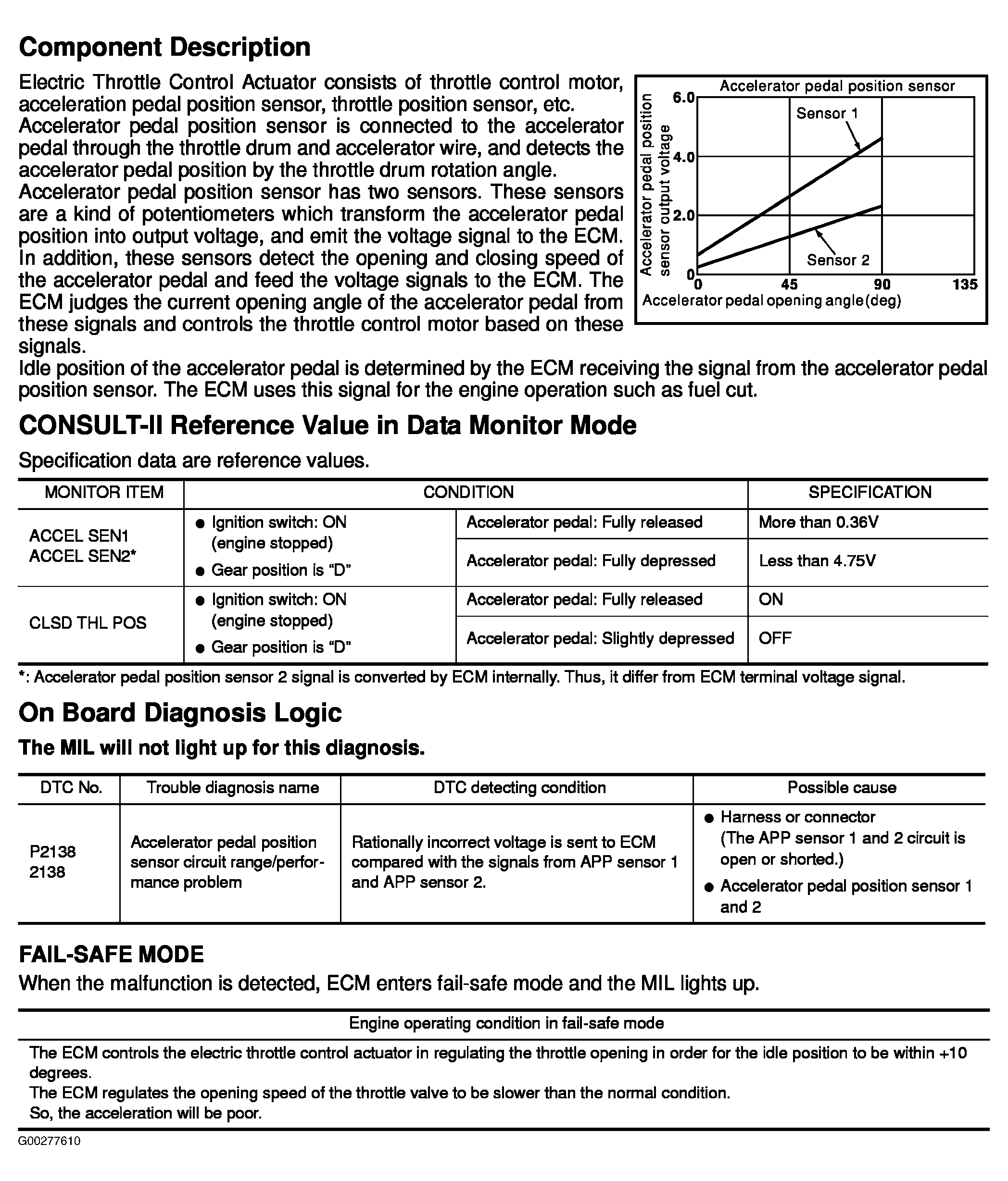 Home >> Nissan-Datsun >> 2004 >> Sentra SE-R Spec V >> Repair and Diagnosis >> External Pages >> Different car >> Section 213 (Engine Controls - Self-Diagnostics) >> Diagnostic Tests >> DTC P2138: Accelerator Pedal Position Sensor >> Component Description, CONSULT-II Reference Value In Data Monitor Mode, On Board Diagnosis Logic & Fail-Safe Mode