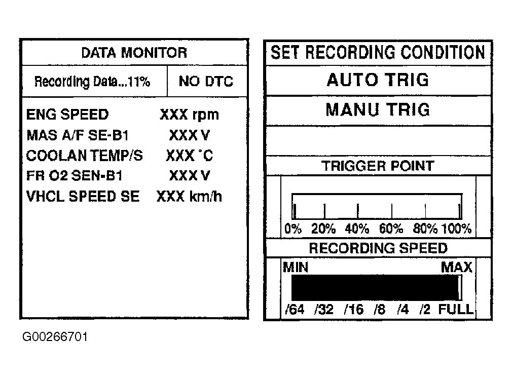 The malfunction will be identified on the CONSULT-II screen in real time. In other words, DTC/1st trip DTC and malfunction item will be displayed if the malfunction is detected by ECM. At the moment a malfunction is detected by ECM, "MONITOR" in "DATA MONITOR" screen is changed to "Recording Data ... xx%" and the data after the malfunction detection is recorded. See Fig 1 . Then when the percentage reached 100%, "REAL-TIME DIAG" screen is displayed. If "STOP" is touched on the screen during "Recording Data ... xx%", "REAL-TIME DIAG" screen is also displayed. The recording time after the malfunction detection and the recording speed can be changed by "TRIGGER POINT" and "Recording Speed". See CONSULT-II operation manual. - Manual Trigger (MANU TRIG)