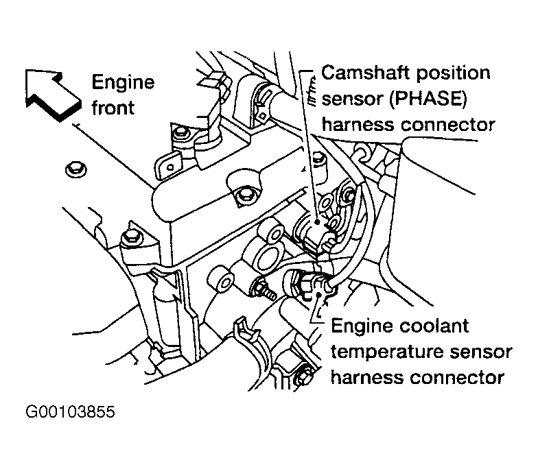 - Remove ECT sensor, and place in heated water. For location, see Figure. Measure resistance between sensor terminals, with water at specified temperatures. See ENGINE COOLANT TEMPERATURE SENSOR RESISTANCE table under DIAGNOSTIC PROCEDURE under DTC P0117 OR DTC P0118: ENGINE COOLANT TEMPERATURE SENSOR. If resistance is as specified, go to next step. If resistance is not as specified, replace ECT sensor.