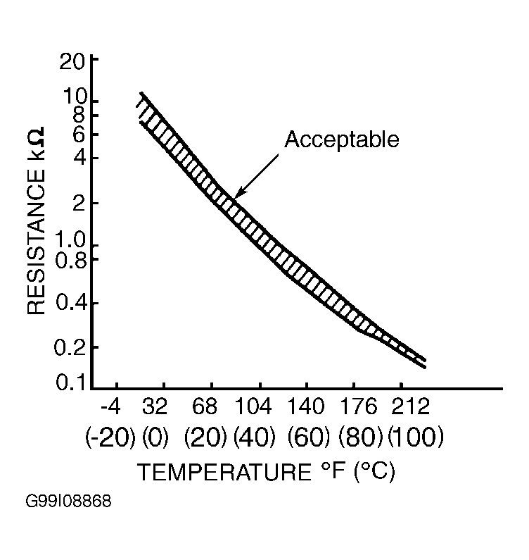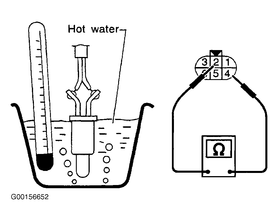 - Remove fuel pump assembly. Measure resistance between fuel pump assembly connector terminals No. 2 and 4, with FTT sensor submerged in heated water. See Fig 3 . Resistance should be within acceptable range shown in illustration. See Figure . If resistance is as specified, go to next step. If resistance is not as specified, replace FTT sensor.