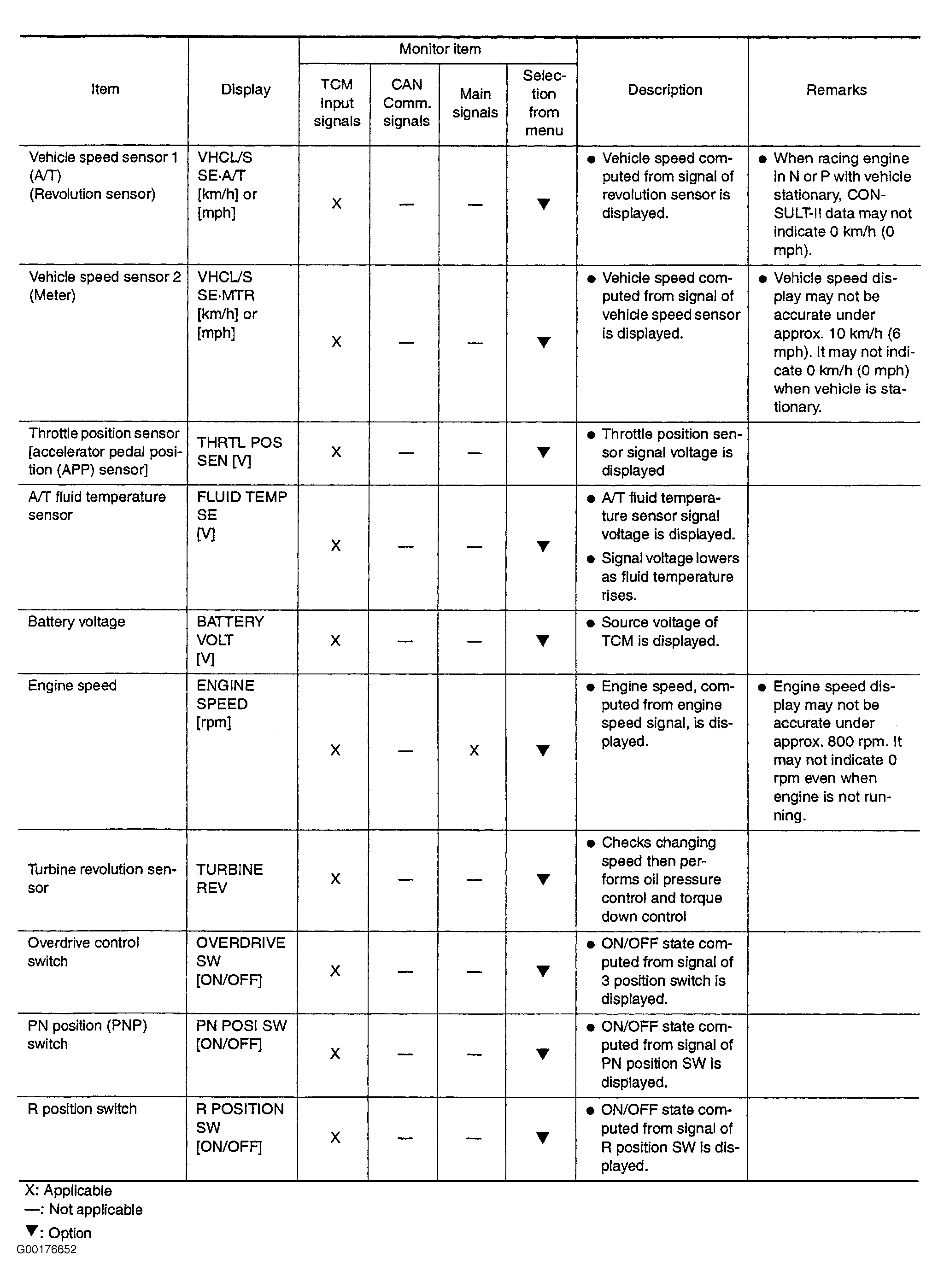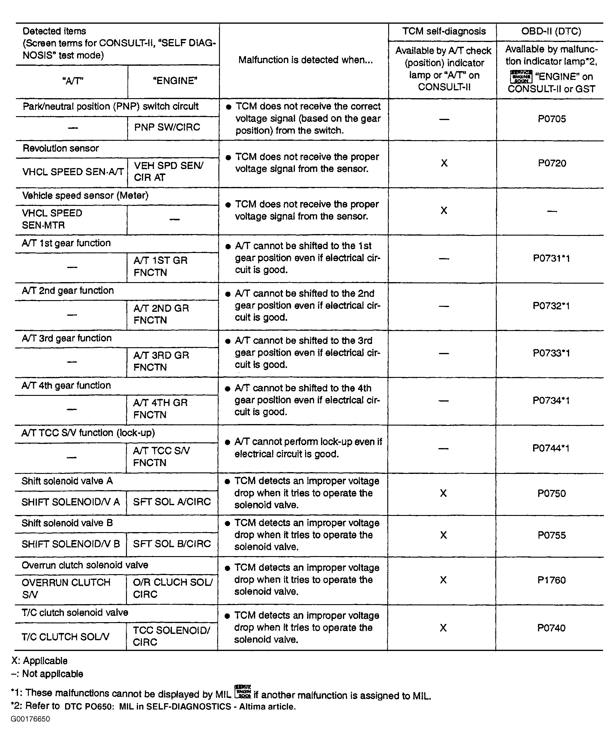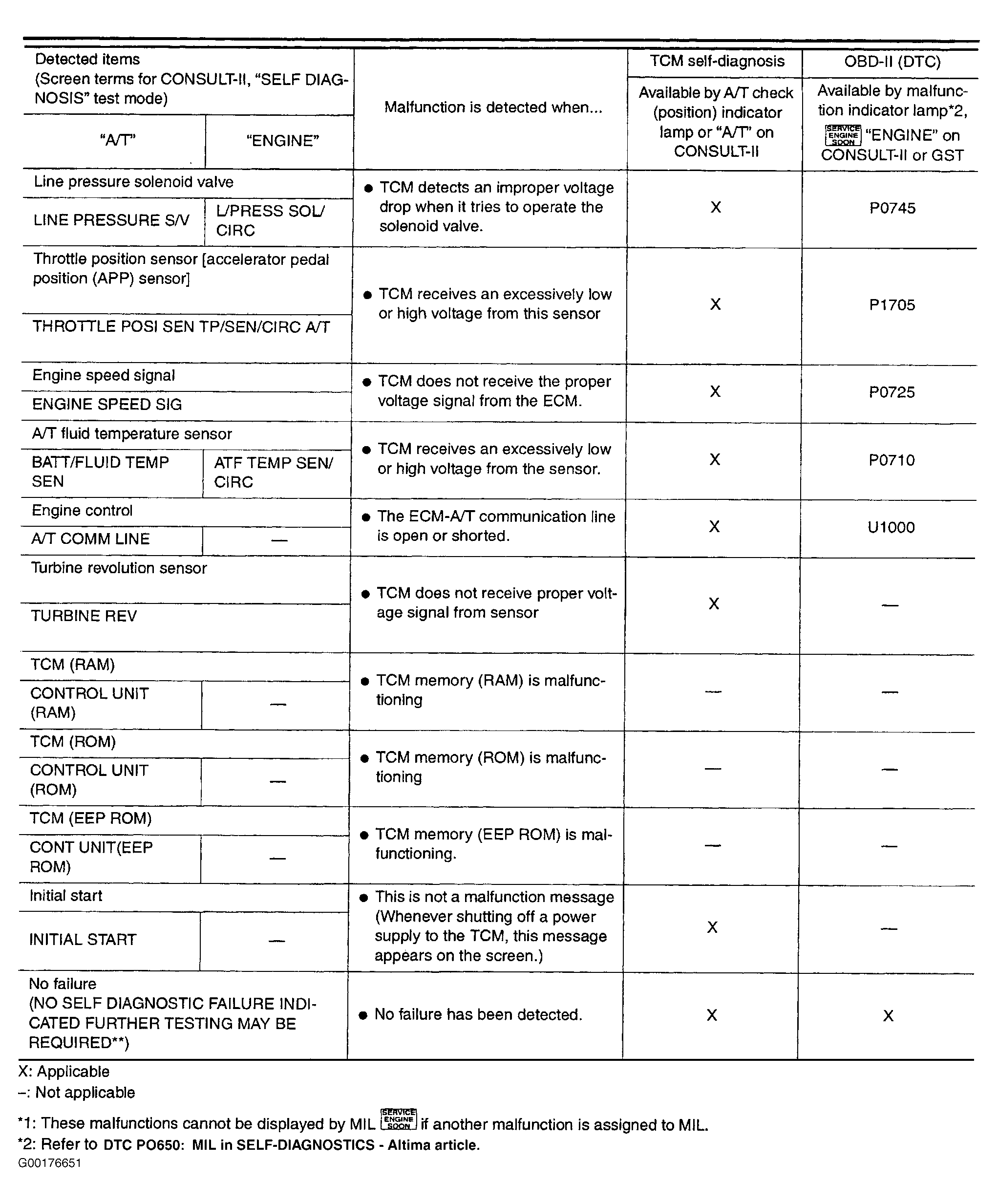 - Turn on CONSULT-II and touch "ENGINE" for OBD-II detected items or touch "A/T" for TCM self-diagnosis. If A/T is not displayed, check TCM power supply and ground circuit. See TCM POWER & GROUND CIRCUITS in 2001-02 AUTOMATIC TRANSMISSIONS article.