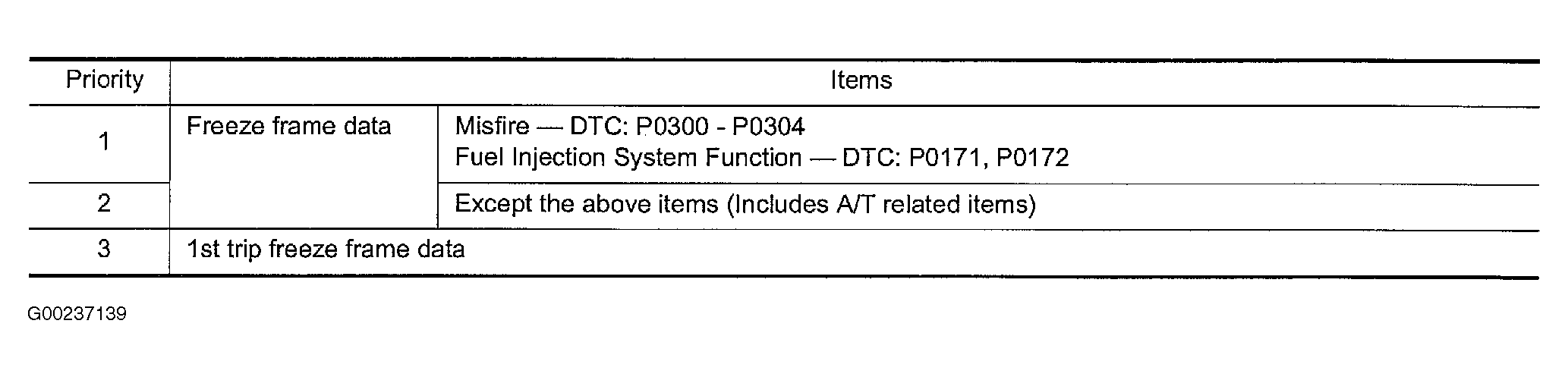 For example, the EGR malfunction (Priority: 2) was detected and the freeze frame data was stored in the 2nd trip. After that when the misfire (Priority: 1) is detected in another trip, the freeze frame data will be updated from the EGR malfunction to the misfire. The 1st trip freeze frame data is updated each time a different malfunction is detected. There is no priority for 1st trip freeze frame data. However, once freeze frame data is stored in the ECM memory, 1st trip freeze data is no longer stored (because only one freeze frame data or 1st trip freeze frame data can be stored in the ECM). If freeze frame data is stored in the ECM memory and freeze frame data with the same priority occurs later, the first (original) freeze frame data remains unchanged in the ECM memory.