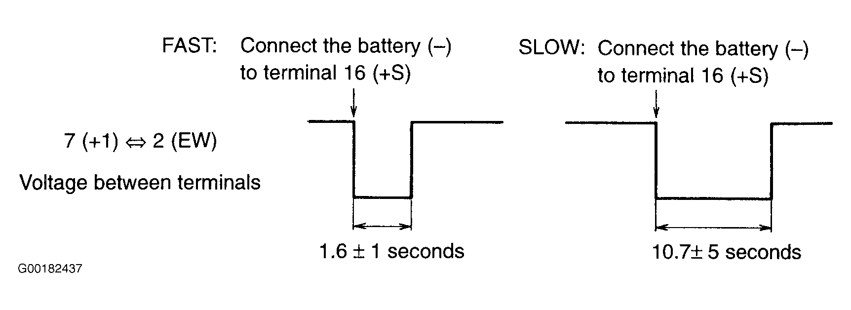 - Check the front wiper operation as follows. Turn the wiper switch to OFF. Connect the battery (+) to terminal No. 17 (+B) of the connector, the battery (-) to terminal No. 16 (+S) and 2 (EW) to the connector. Connect the voltmeter (+) terminal to terminal No. 7 (+1) of the connector and the voltmeter (-) terminal to terminal No. 2 (EW) of the connector. Turn the washer switch to ON and OFF. Voltage should be as shown in illustration. See Fig 2.