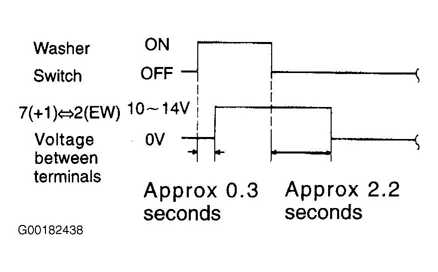 Switch Position Tester Connection Specified Condition Front Wiper Switch MIST 7 (+1) - 17 (+B) Continuity OFF 16 (+S) - 7 (+1) Continuity INT (1) 16 (+S) - 7 (+1) Continuity AUTO (2) 16 (+S) - 7 (+1), 4 (AUTO) - 14 (E) Continuity LO 7 (+1) - 17 (+B) Continuity HI 17 (+B) - 8 (+2) Continuity Front Washer Switch OFF ..... No Continuity ON 11 (WF) - 2 (EW) Continuity (1) Without AUTO wiper system. (2) With AUTO wiper system. - Check the intermittent operation as follows. Connect the voltmeter (+) terminal to terminal No. 7 (+1) of the connector, the voltmeter (-) terminal to terminal No. 2 (EW) of the connector. Connect the battery (+) to terminal No. 17 (+B) of the connector, the battery (-) to terminals No. 2 (EW) and 16 (+S) of the connector. Turn the wiper switch to INT. Connect the battery (+) to terminal No. 16 (+S) of the connector for 5 seconds. Connect the battery (-) to terminal No. 16 (+S) of the connector. Voltage should be as shown in illustration. See Fig 1.