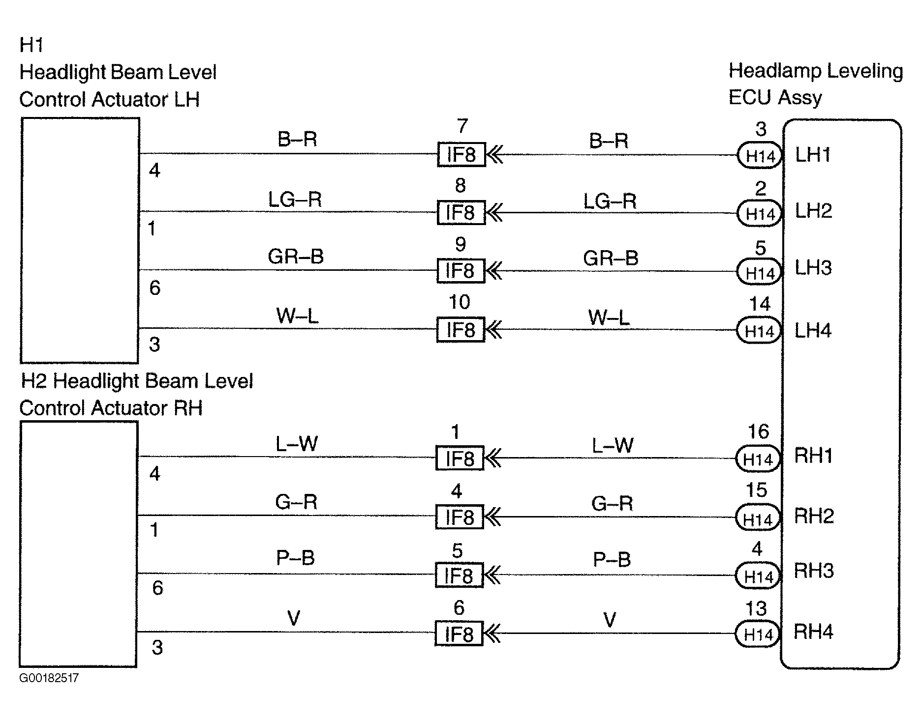 1. Check the continuity between the vehicle side wiring harness between the headlight leveling ECU and headlight leveling motor. See Fig 1. If there is continuity, go to the next step. If there is not continuity, repair or replace harness or connector.