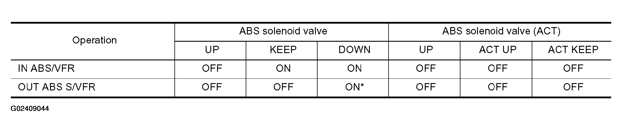 - For the ABS solenoid valve, touch "UP", "KEEP", "DOWN" on the display screen. For the ABS solenoid valve (ACT), touch "UP", "ACT UP", "ACT KEEP" and confirm that the solenoid valves (in, out, USV, HSV) operate as shown in Fig 2 and Fig 3.