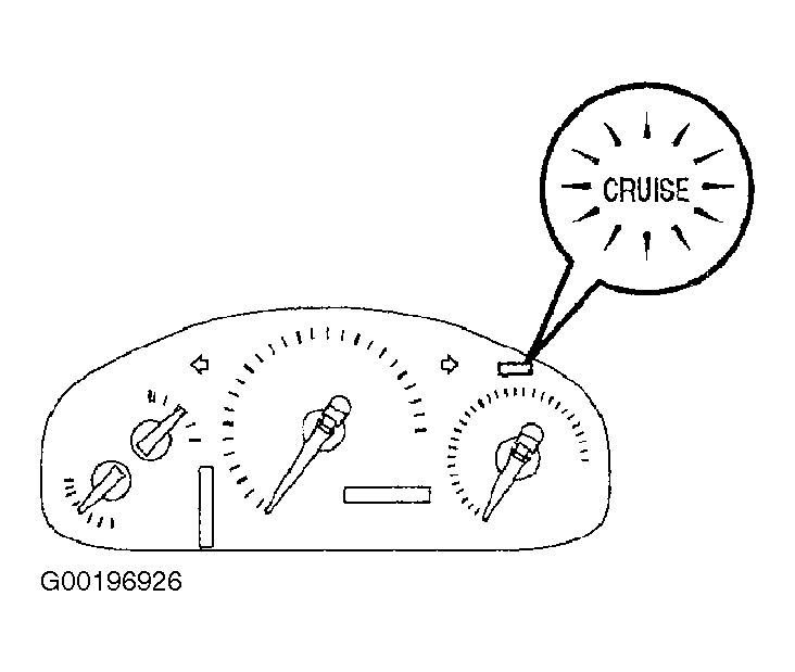 - Check Indicator - Turn the ignition switch ON. Check that the CRUISE main indicator light comes ON when the cruise control main switch is turned ON, and that the indicator light goes OFF when the main switch is turned OFF. See Fig 1. If the indicator check result is not normal, proceed to combination meter trouble shooting. See appropriate INSTRUMENT PANEL article.
