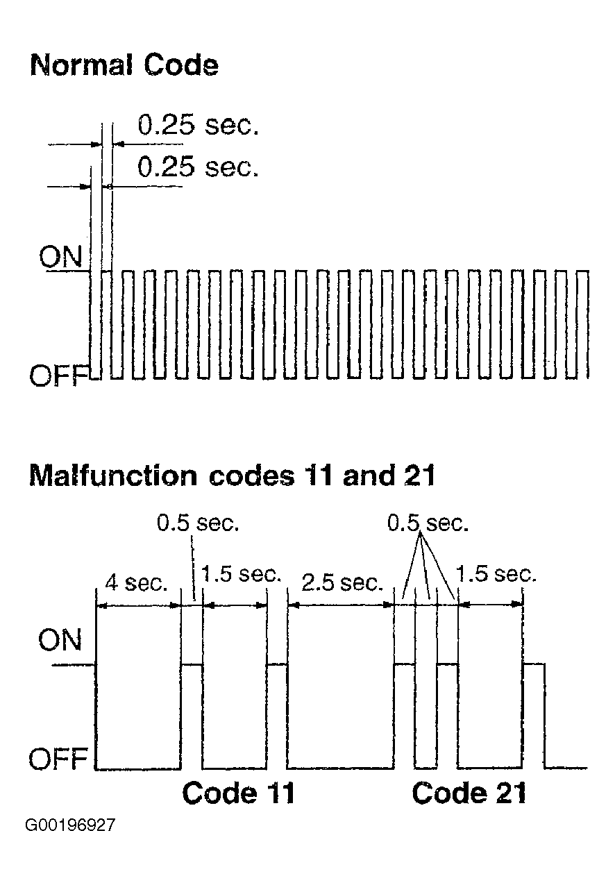 - Output Of DTC Using Diagnosis Check Wire - Turn the ignition switch ON. Using Diagnosis Check Wire No. 2 (SST 09843-18040), connect terminal No. 13 (Tc) and 4 (CG) of the DLC3. See CONNECTOR IDENTIFICATION . Read the DTC on the CRUISE MAIN indicator light. If the DTC is not output, inspect the diagnosis circuit. As an example, the blinking patterns for codes; normal, 11 and 21 are shown. See Fig 3.