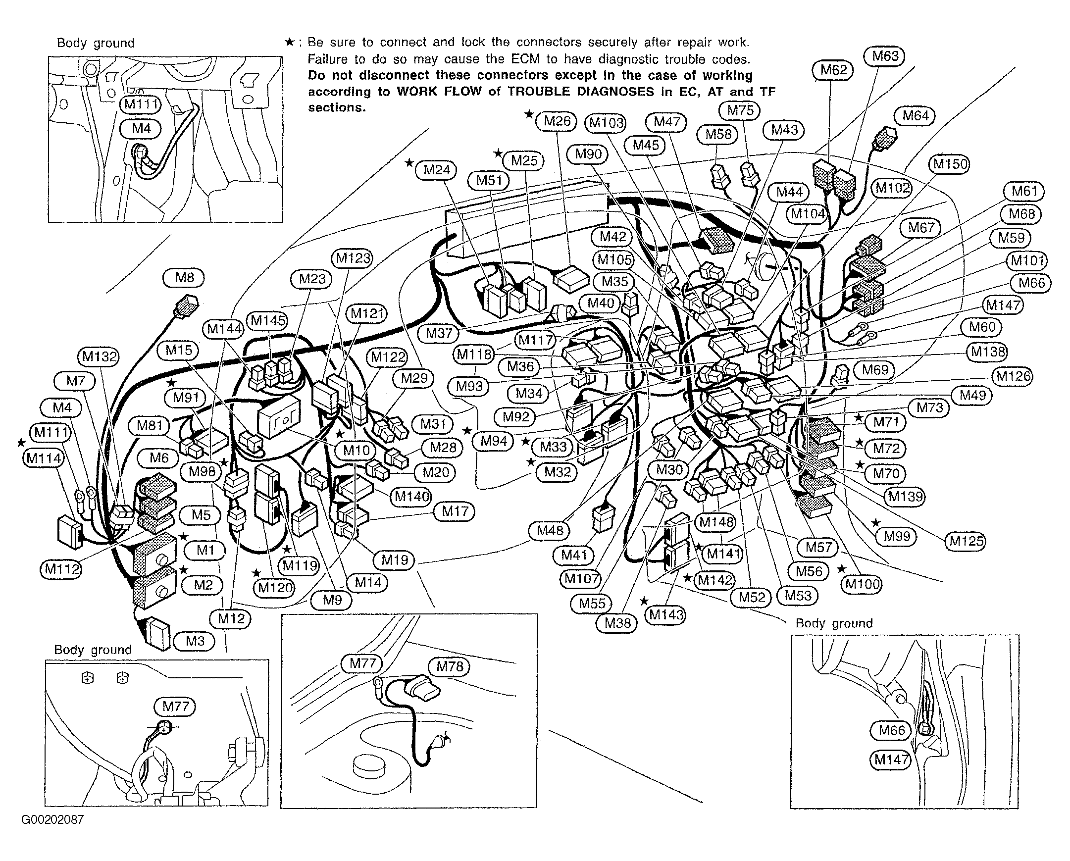 | Body Grounds M4, M66, M77, M111 & M147 | Behind Dash, See Fig 1 |