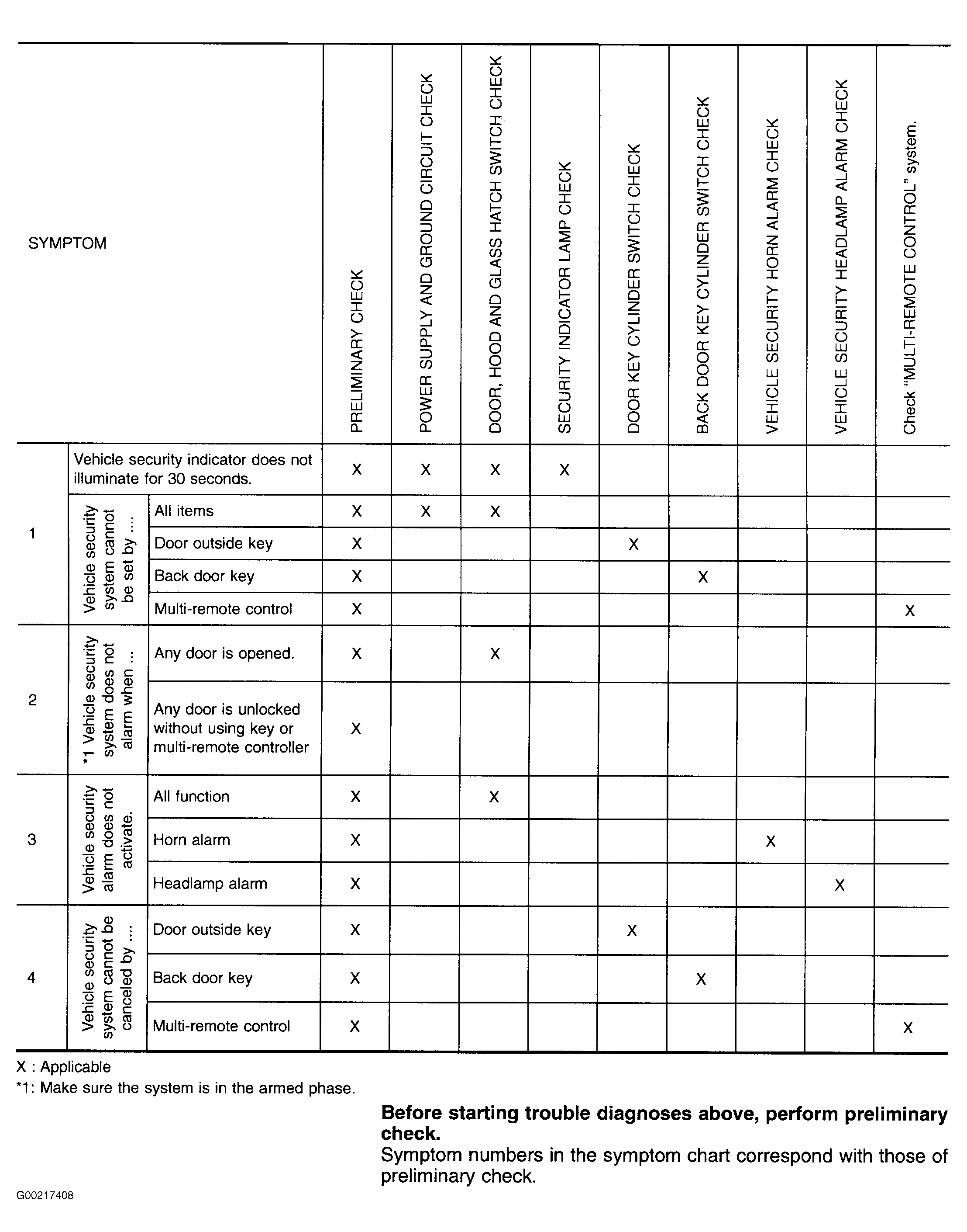 NOTE: For preliminary check, see PRELIMINARY CHECK  , for power supply and ground circuit check, see POWER SUPPLY & GROUND CIRCUIT TEST  , for door, hood and glass hatch switch check, see DOOR, HOOD & GLASS HATCH SWITCH TEST  , for security indicator lamp check, see SECURITY INDICATOR LAMP TEST  , for door key cylinder switch check, see FRONT DOOR KEY CYLINDER SWITCH TEST  , for back door key cylinder switch check, see BACK DOOR KEY CYLINDER SWITCH TEST  , for vehicle security horn alarm check, see VEHICLE SECURITY HORN ALARM TEST  , and for vehicle security headlamp alarm check, see VEHICLE SECURITY HEADLAMP ALARM OPERATION TEST  . For remote keyless entry, see REMOTE KEYLESS ENTRY SYSTEM - PATHFINDER article.