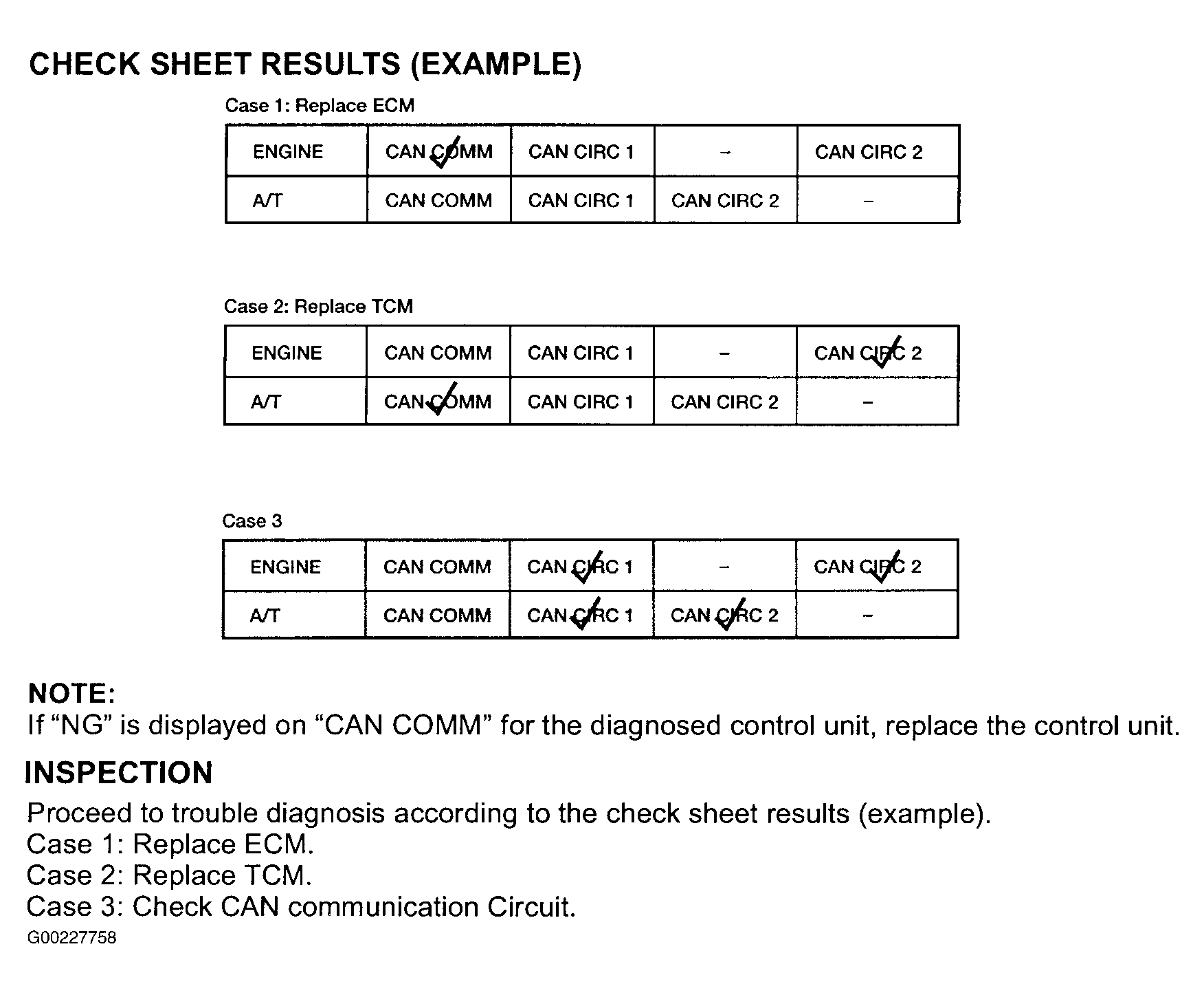 NOTE: If "NG" is displayed on "CAN COMM" for the diagnosed control unit, replace the control unit.