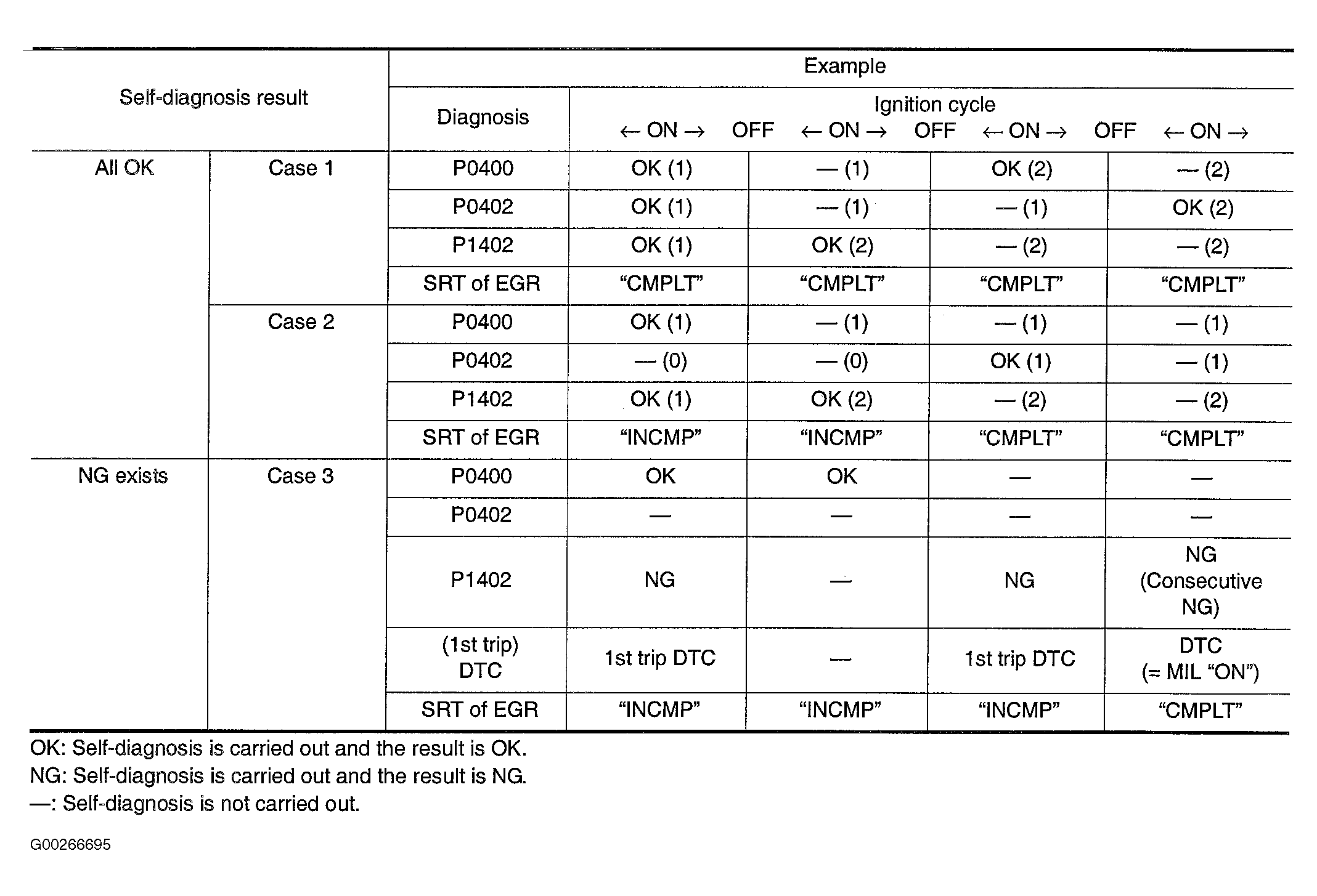 When all SRT related self-diagnoses showed OK results in a single cycle (Ignition OFF-ON-OFF), the SRT will indicate "CMPLT". See Case 1 in Fig 1 . When all SRT related self-diagnoses showed OK results through several different cycles, the SRT will indicate "CMPLT" at the time the respective self-diagnoses have at least one OK result. See Case 2 in Fig 1 . If one or more SRT related self-diagnoses showed NG results in 2 consecutive cycles, the SRT will also indicate "CMPLT". See Case 3 in Fig 1 .