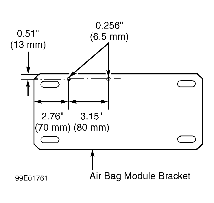 - Firmly secure Air Bag Module Bracket (J41246) in a vise. Drill 2 holes, each 0.256" (6.5 mm) in diameter in air bag module bracket at position shown in illustration. See Fig 1 .