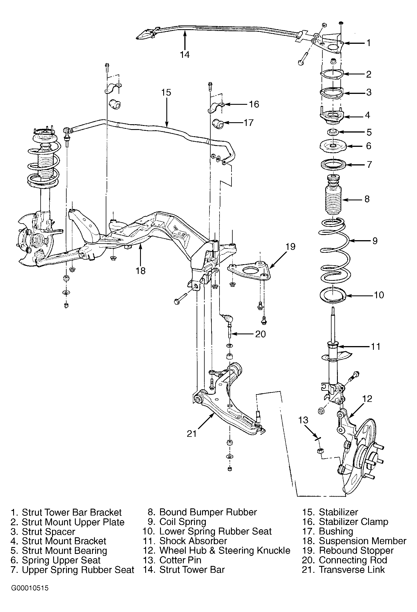 Lower end of strut is bolted to steering knuckle. Steering knuckle is attached to transverse link by a ball joint. Transverse links are attached to suspension member by pivot bolts and compression rod clamp. Stabilizer bar is attached to transverse link.