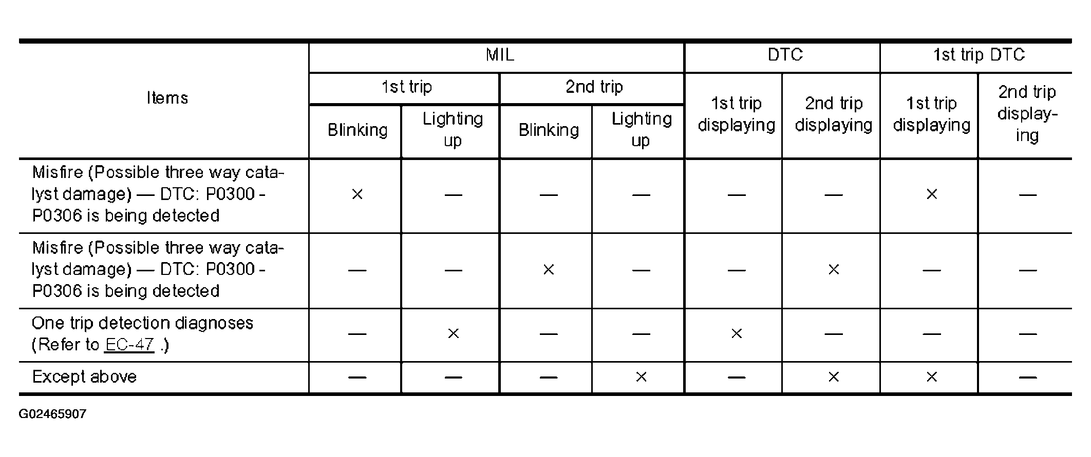 If the same malfunction is detected again during the next drive, the DTC and Freeze Frame data are stored in the ECM memory, and the MIL lights up. The MIL lights up at the same time when the DTC is stored. < 2nd trip > The "trip" in the "Two Trip Detection Logic" means a driving mode in which self-diagnosis is performed during vehicle operation. Specific on board diagnostic items will cause the ECM to light up or blink the MIL, and store DTC and Freeze Frame data, even in the 1st trip, as shown in Fig 1.