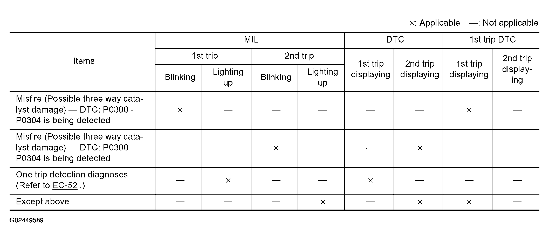 If the same malfunction is detected again during the next drive, the DTC and Freeze Frame data are stored in the ECM memory, and the MIL lights up. The MIL lights up at the same time when the DTC is stored. <2nd trip> The "trip" in the "Two Trip Detection Logic" means a driving mode in which self-diagnosis is performed during vehicle operation. Specific on board diagnostic items will cause the ECM to light up or blink the MIL, and store DTC and Freeze Frame data, even in the 1st trip, as shown below in Fig 1.